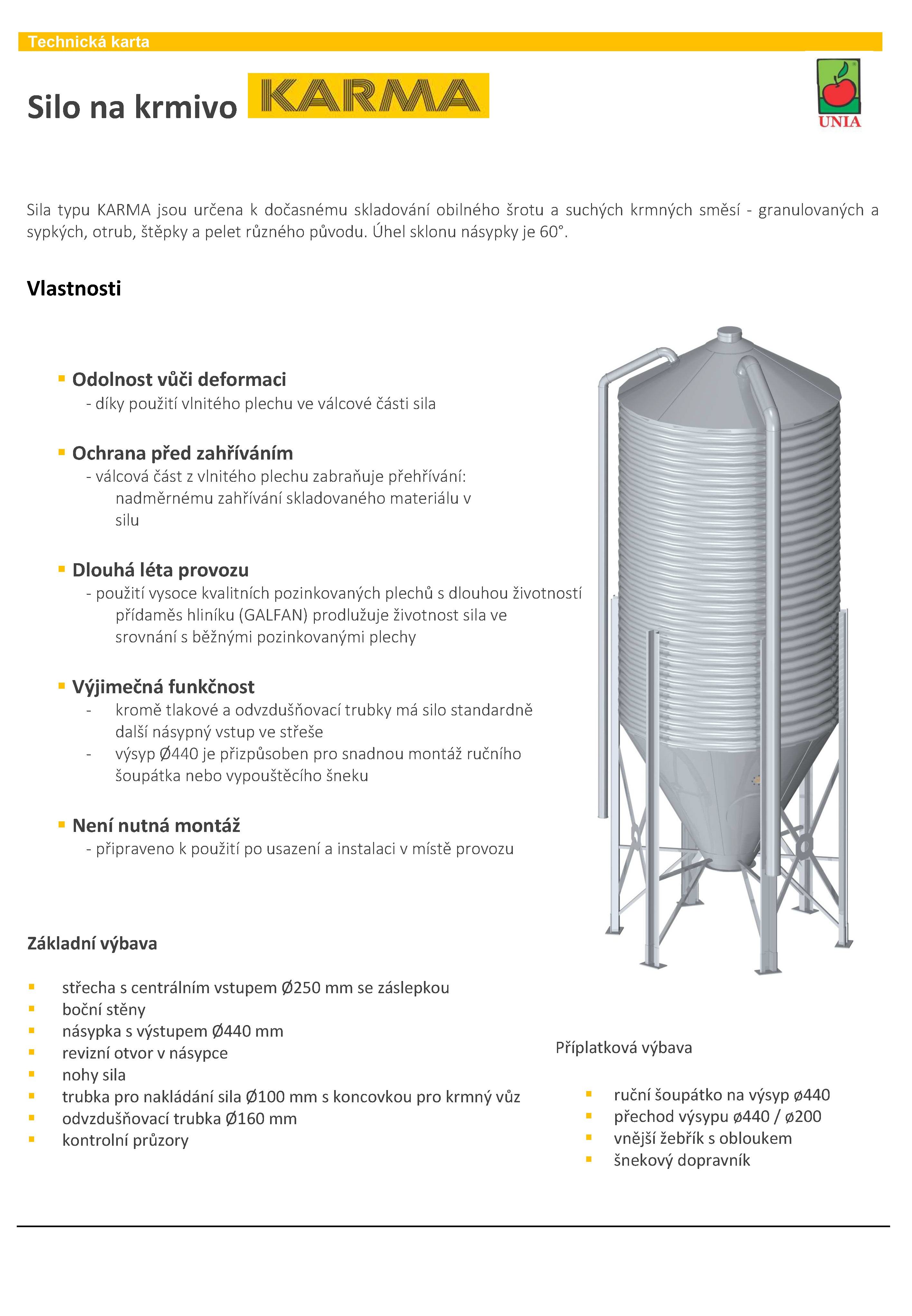 Sila typu KARMA jsou určeny pro skladování obilních šrotů, vloček, krmných směsí, granulovaných i sypkých, dřevních peletek a podobného drobného materiálu. Úhel výsypu je 60°. Silo je určeno pouze pro dočasné usklanění, jelikož neni možno u tohoto typu řešit provzdušnění zrna. Sila jsou dodávany již smontované, stačí je pouze postavit jeřábem na předem připravený betonový podklad. Nosnost podaná pro krmivo o hustotě 0,65t/m3.