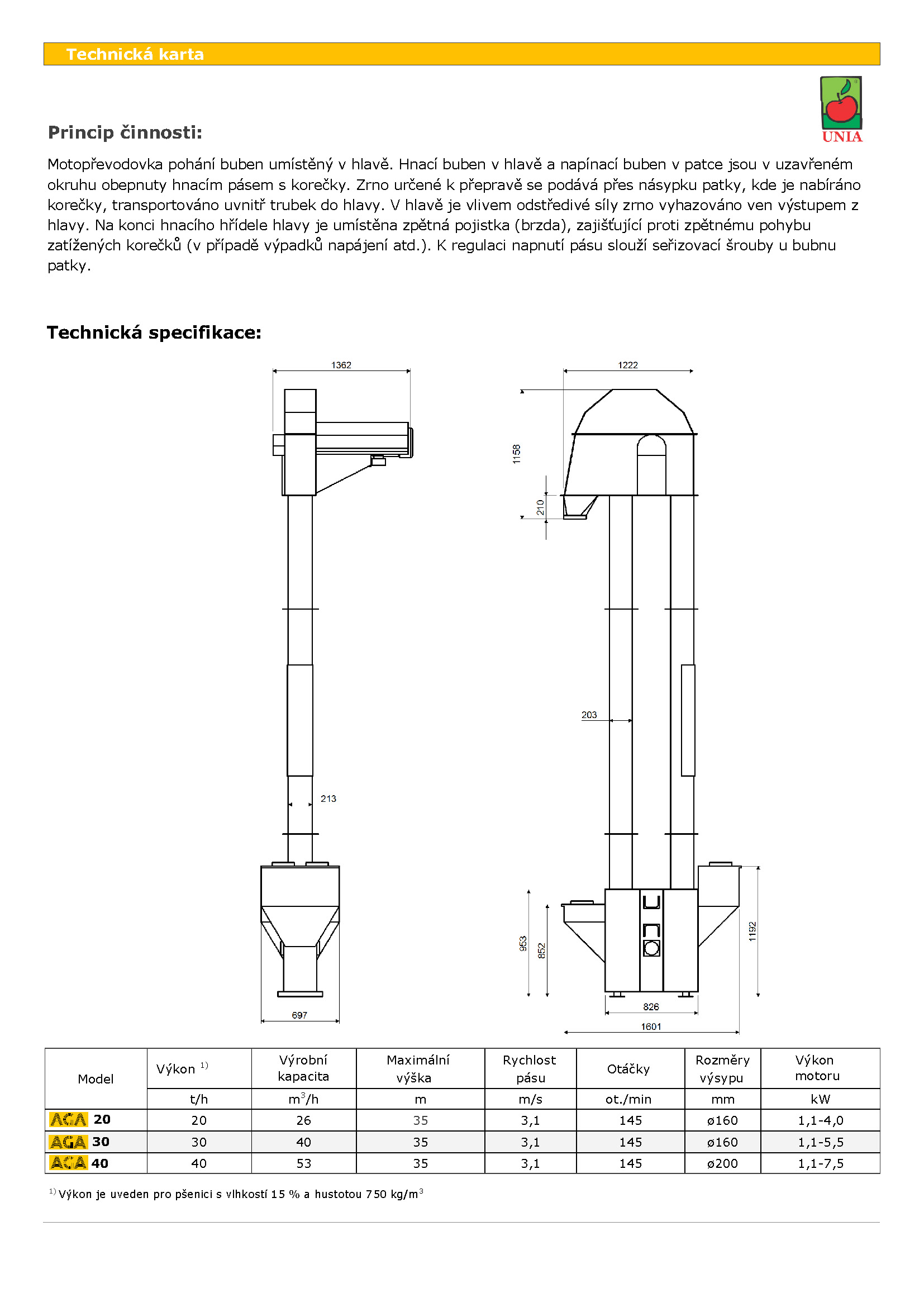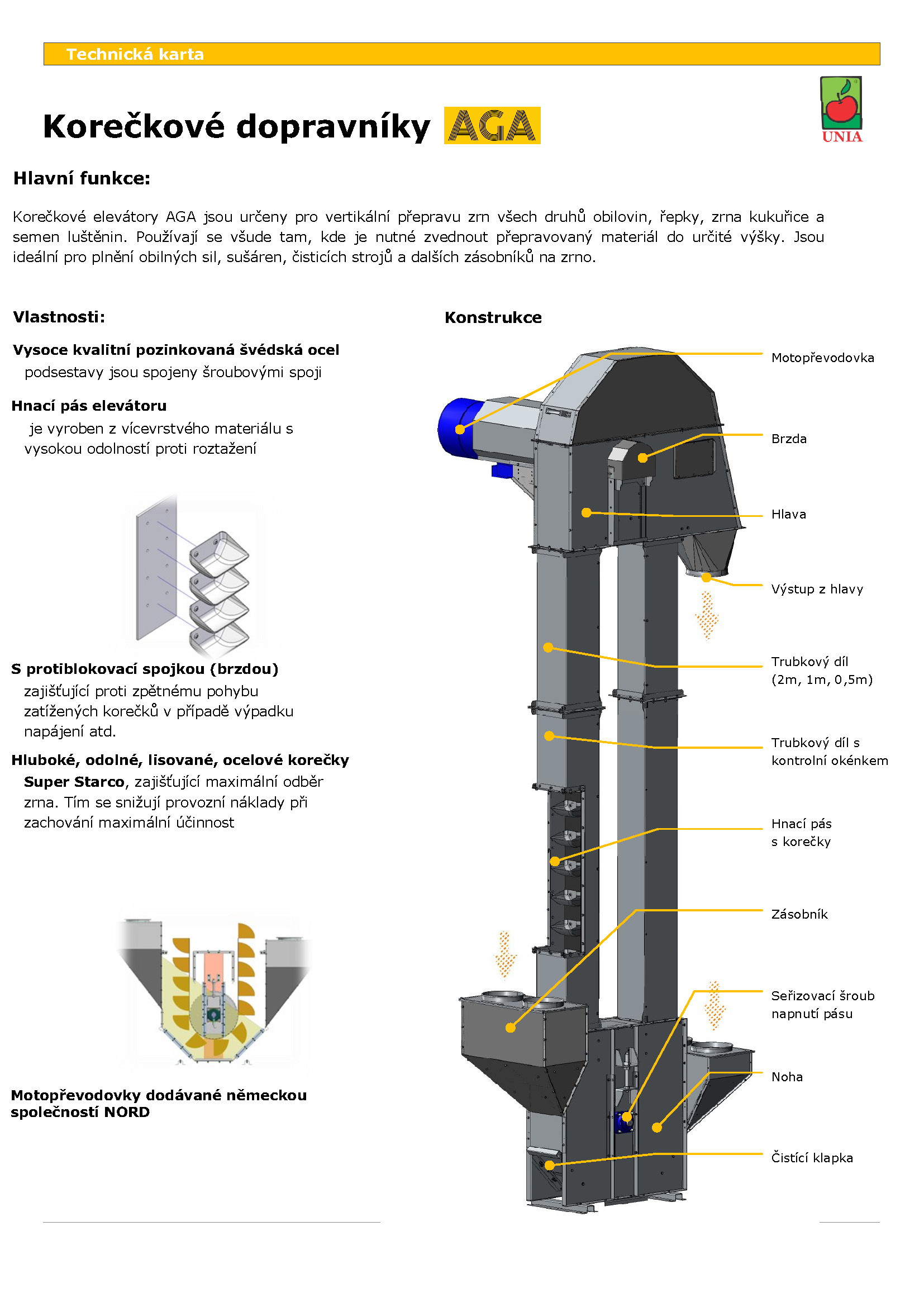 Korečkové elevátory AGA jsou určeny pro vertikální přepravu zrn všech druhů obilovin, řepky, zrna kukuřice a semen luštěnin. Používají se všude tam, kde je nutné zvednout přepravovaný materiál do určité výšky. Jsou ideální pro plnění obilných sil, sušáren, čisticích strojů a dalších zásobníků na zrno.