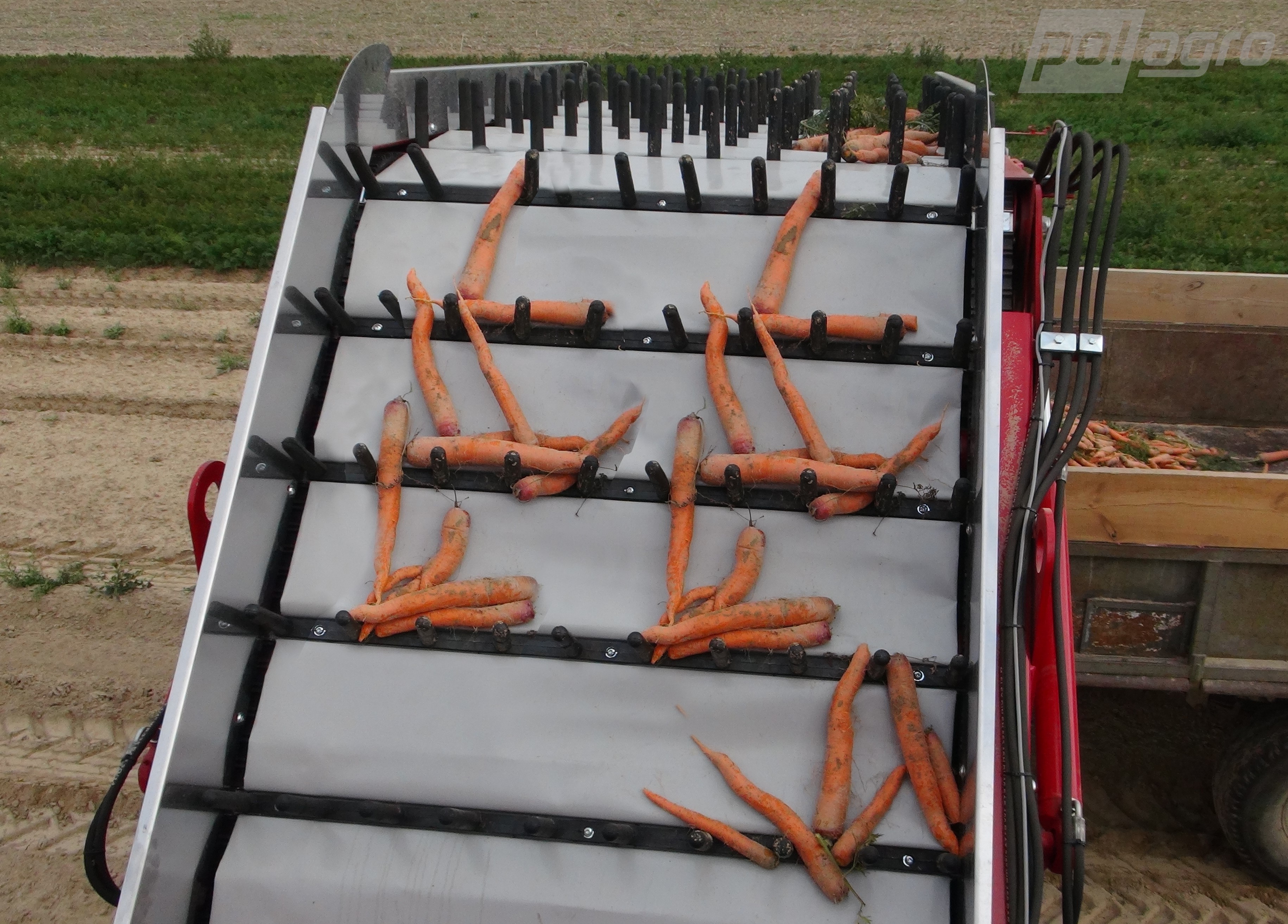 Efektivní čištění sbírané zeleniny zabezpečují rotační třepačky umístěné podél sběrné jednotky přímo pod každým sběrným pásem. Třídílný dopravník pro transport zeleniny s plynulou nastavení regulace výšky s kabiny obsluhy.