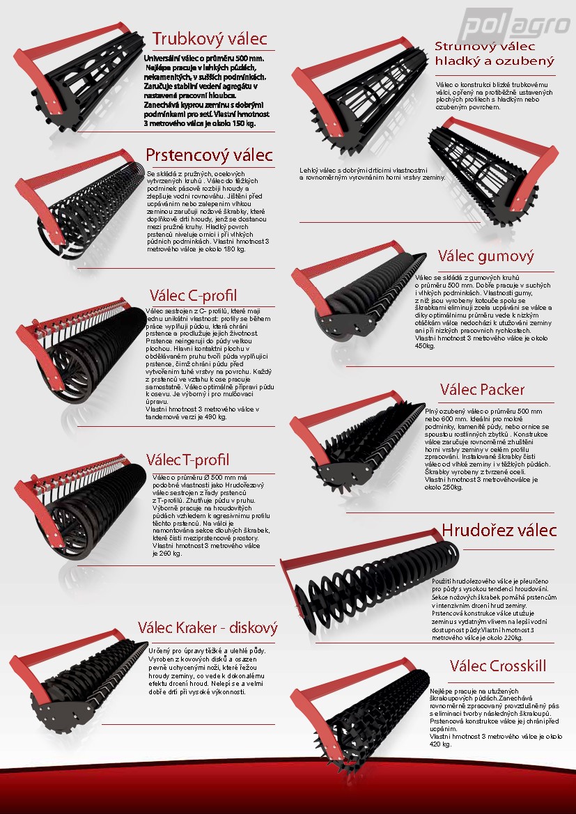 V základním provedení válec trubkový, či strunový 500mm, dvě řady disků Ø510mm nebo Ø560mm, jištění pomocí gumových amortizátorů, boční deflektory, rozchod mezi řadami disků 85cm. Možnost nastavení hloubky práce mechanicky na zadním válci, či za příplatek hydraulicky.