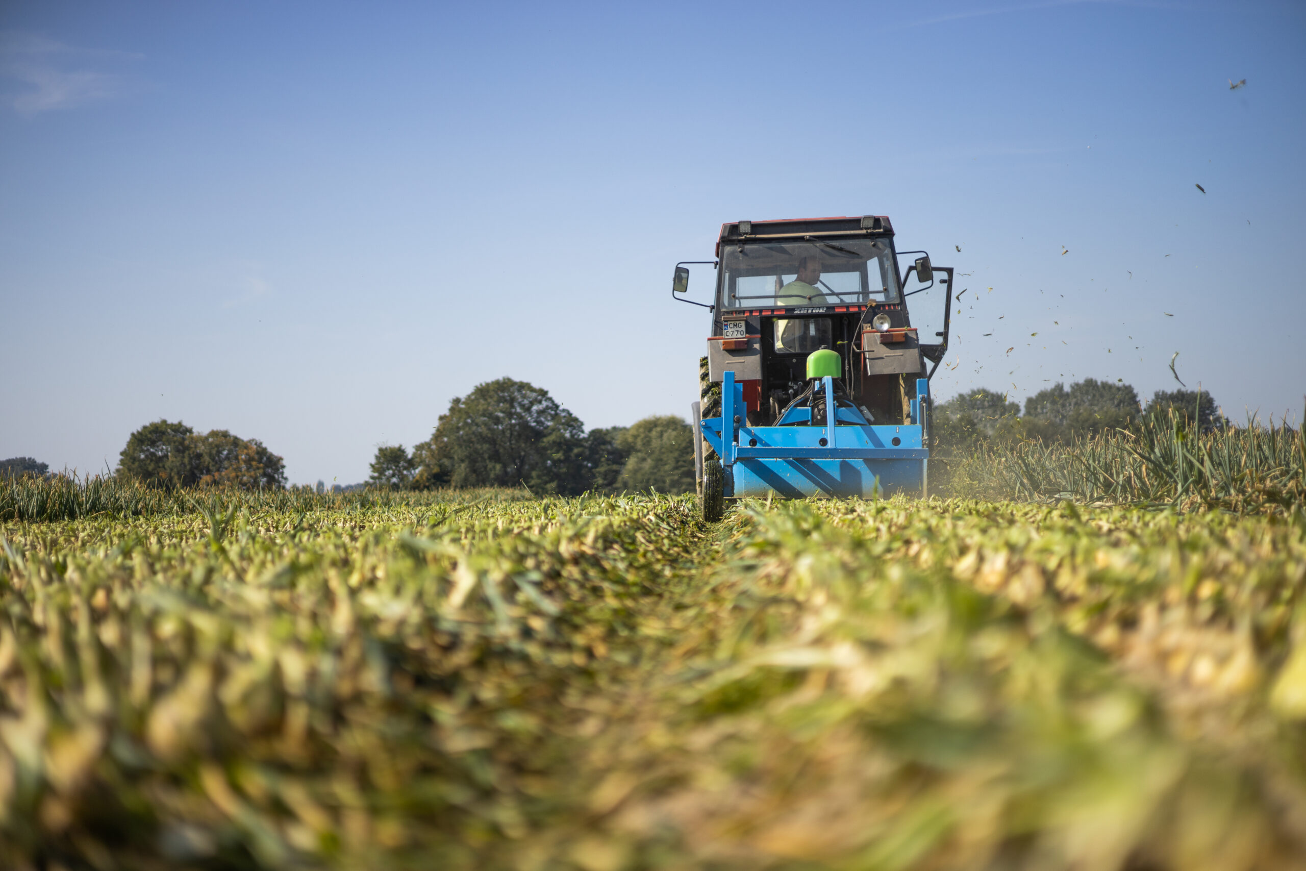 Pohon řezacích hlav je přenášen pomocí hnací hřídele z vývodové hřídele (PTO) agregovaného traktoru, zatímco výška sečení se reguluje hydraulicky z kabiny traktoru. Obsluha má možnost nezávislého nastavení výšky sečení pro levou a pravou stranu stroje v rozsahu od 0 do 40 cm, díky čemuž může ještě přesněji přizpůsobit nastavení řezacích nožů sklonu či nerovnostem terénu. Každá ze tří pracovních hlav má namontovány po dvou řezacích nožích. Úhel sklonu nožů je 45º vůči podloží. Namontované speciálně profilované kryty řezacího ústrojí způsobují, že uvedením do pohybu řezací hlavy vytvářejí podtlak vzduchu, který zvedá ležící a polámanou nať vzhůru. Díky tomuto efektu dochází k velmi přesnému, téměř stoprocentnímu očištění cibule od natě.