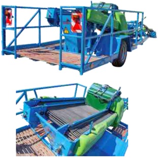 - Třídicí stůl a plošina pro obsluhu: Je vybaven třídicím stolem, kde obsluha ručně dotříďuje brambory, a plošinou pro obsluhu