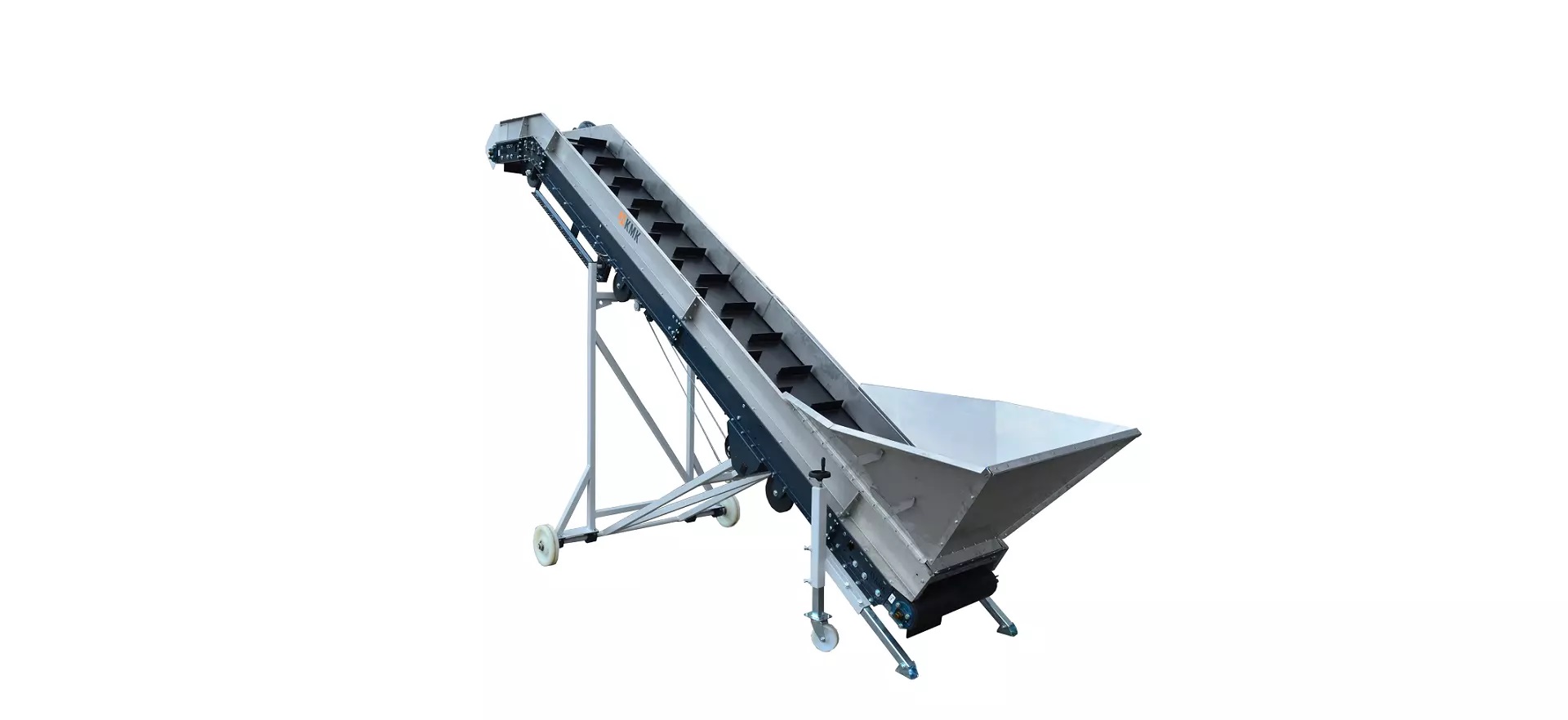 PLM Mobilní dopravní pás je univerzální dopravník. Díky širokému rozsahu nastavení výšky a mobilní konstrukci přizpůsobené pro snadnou přepravu je tento dopravník všestranným strojem. Mobilní dopravní pásy PM jsou vybaveny motorem s hydraulickým čerpadlem, které umožňuje plynulé nastavení výšky, gumovým pásem s lopatkami ve tvaru rybí kosti a prostorným příjmovým zásobníkem. Rychlost pásu a výška nakládání jsou snadno nastavitelné pomocí kabelového dálkového ovladače.Dopravníky PM jsou založeny na mobilním rámu s pneumatickými koly, která umožňují snadné přemísťování dopravníku. Kromě toho jsou dopravníky PM vybaveny opěrnými nohami, které usnadňují otáčení kol a stabilizují dopravník ve zvolené poloze.