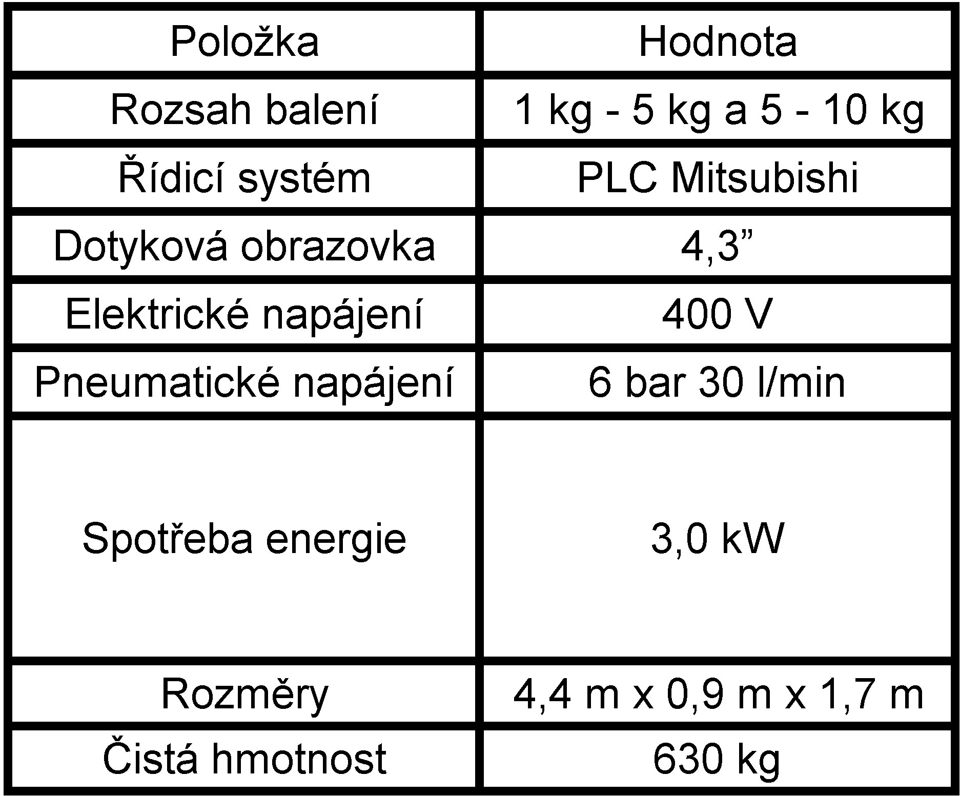 - Rozsah balení: 1 kg - 10 kg (dle nastavení a modelu)