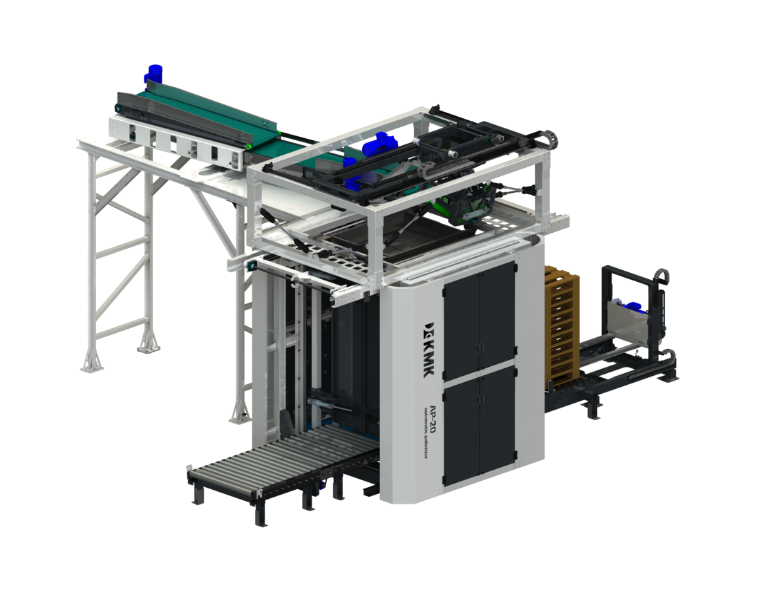 Použití servopohonu umožňuje dosáhnout vysoké přesnosti bez snížení výkonu stroje. Uspořádání pytlů na paletě je plně konfigurovatelné pomocí přehledného, intuitivního dotykového panelu Mitsubishi, ze kterého operátor řídí provoz stroje. Po naskládání vrstvy pytlů se desky odsunou a vrstva pytlů zůstane na paletě, která je zavěšena v komoře paletizátoru. Dokonale rovné, stabilní a kompaktní stohování pytlů na paletě je zaručeno aktivními deskami pracujícími v komoře paletizátoru. Při stohování dalších vrstev pytlů stroj postupně snižuje polohu palety. Po umístění daného počtu vrstev na paletu je ta spuštěna na dno komory, jejíž dveře se otevřou. Paleta s naskládanými pytli automaticky opustí komoru na válečkovém dopravníku. Přísun palet do zařízení je zajištěn podavačem, jehož provoz je řízen systémem senzorů. Přístup k pracovním částem paletizátoru AP20 je zajištěn plošinou vybavenou bezpečnostním systémem.