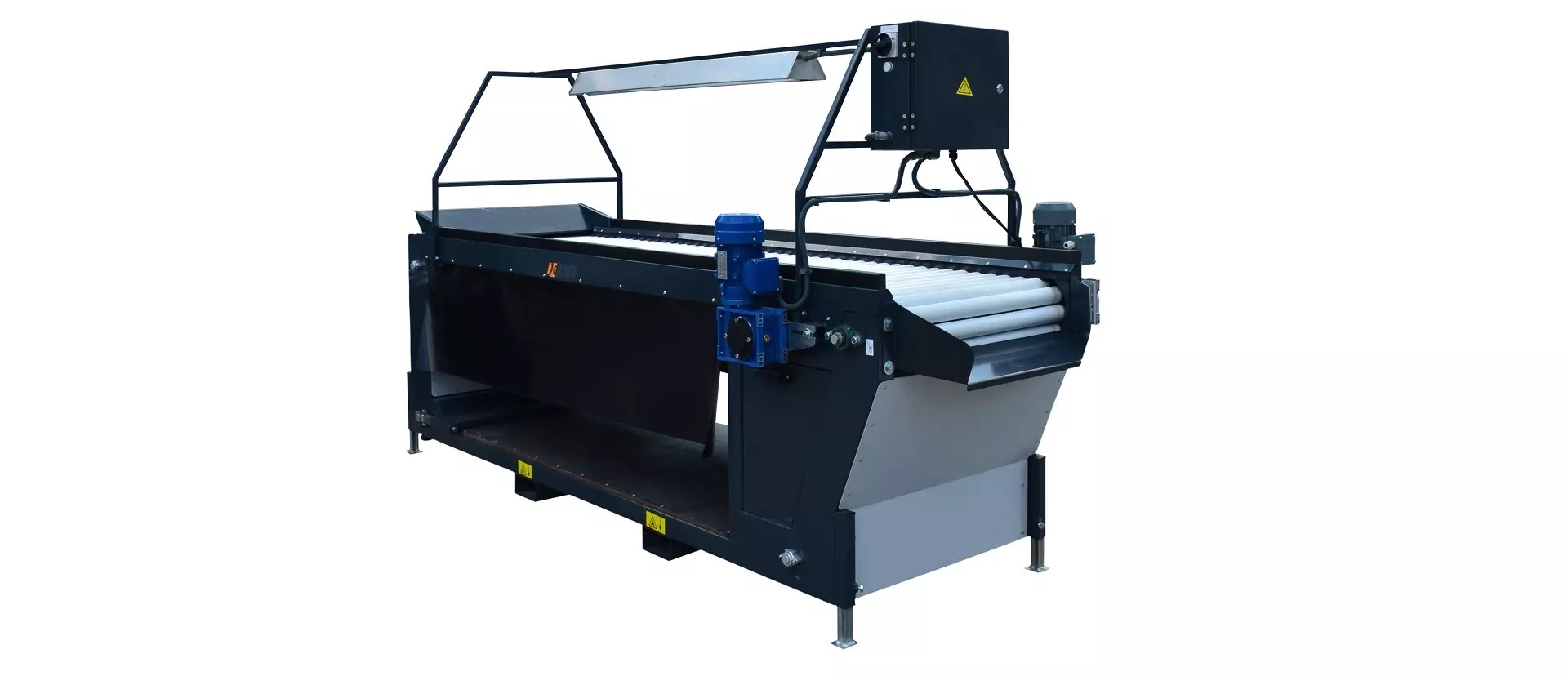 Plodiny, které se vejdou do mezery vytvořené mezi válci vedenými na dvou úrovních, propadnou válci a jsou odváděny dopravníky pro různé velikosti produktů. Výška válců se nastavuje pomocí rukojeti. Rychlost posunu válců je nastavitelná pomocí invertoru. Zelenina vstupuje do stroje na plochém dopravníku integrovaném se strojem. Šířka dopravníku zajišťuje rovnoměrné rozložení produktu po celé pracovní šířce stroje a jeho efektivní využití. Standardně je stroj vybaven výsypným žlabem. V závislosti na modelu stroje může třídič produkovat čtyři nebo pět sort. Standardně je konstrukce stroje práškově lakovaná, zatímco všechny prvky, které přicházejí do styku s potravinami, jsou vyrobeny z kyselinovzdorné oceli nebo certifikovaných umělých materiálů.