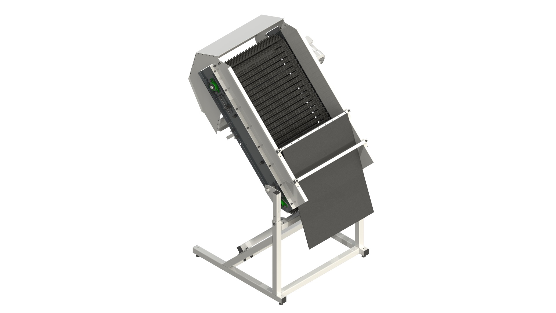 Vertikální ježkový čistič JV je specializované zařízení určené k čištění zeleniny a ovoce od zbytků zeminy a drobných nečistot. Je vybaven dopravníkovým pásem s gumovými výstupky, které účinně odstraňují nečistoty z povrchu produktů. Stroj umožňuje plynulé nastavení rychlosti pásu (pomocí invertoru) a nastavitelný pracovní úhel, což zajišťuje flexibilitu pro různé druhy produktů. Robustní rám je vyroben z otryskané oceli a dvakrát potažen práškovou barvou, což zajišťuje odolnost a odolnost vůči drsným pracovním podmínkám. Stroj je k dispozici ve dvou pracovních šířkách: 0,8 m a 1,2 m, což umožňuje přizpůsobení specifickým výrobním potřebám.
