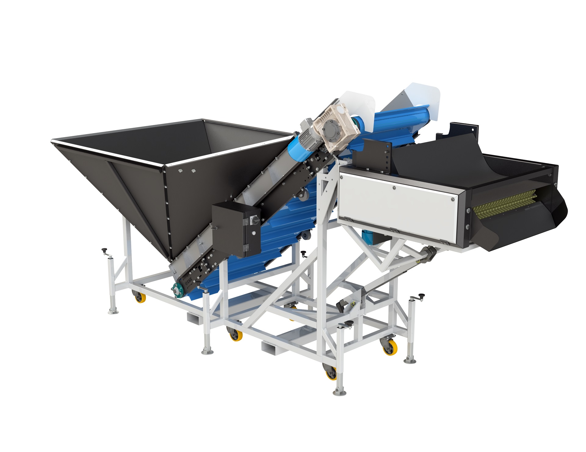 Přijímací zásobník ZB je zařízení určené pro vykládání beden a big-bagů se zeleninou. V závislosti na zvoleném vybavení je dávkovací zásobník ZB vybaven PVC nebo tyčovým pásem. Nad pásem se nachází kryt ve tvaru střechy, který zabraňuje přetížení pásu. Díky plynulému nastavení rychlosti je zelenina rovnoměrně přiváděna do následujících částí technologické linky. Volitelně může být stroj vybaven separátorem nečistot, který umožňuje třídit hroudy a drobné nečistoty.