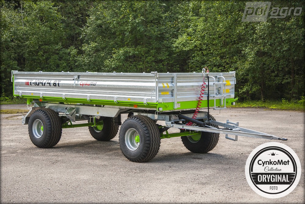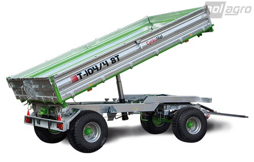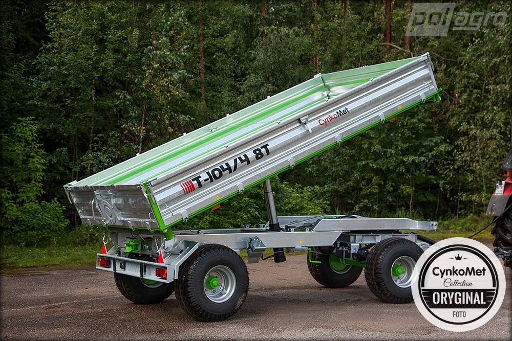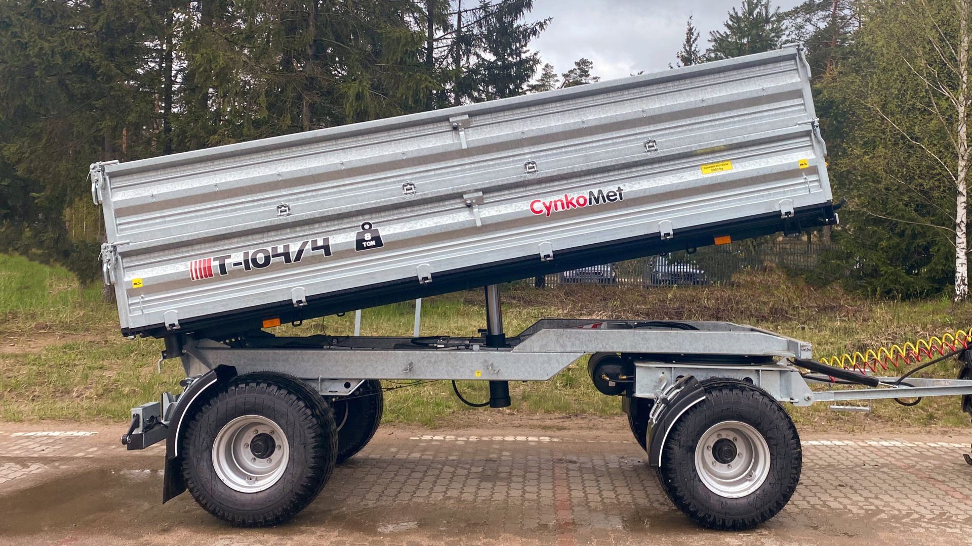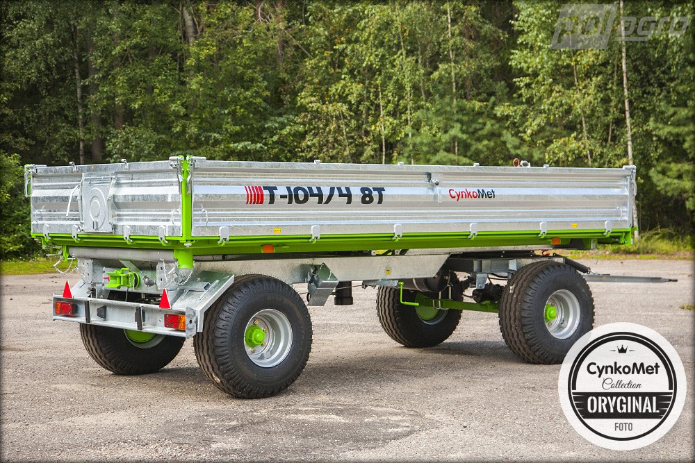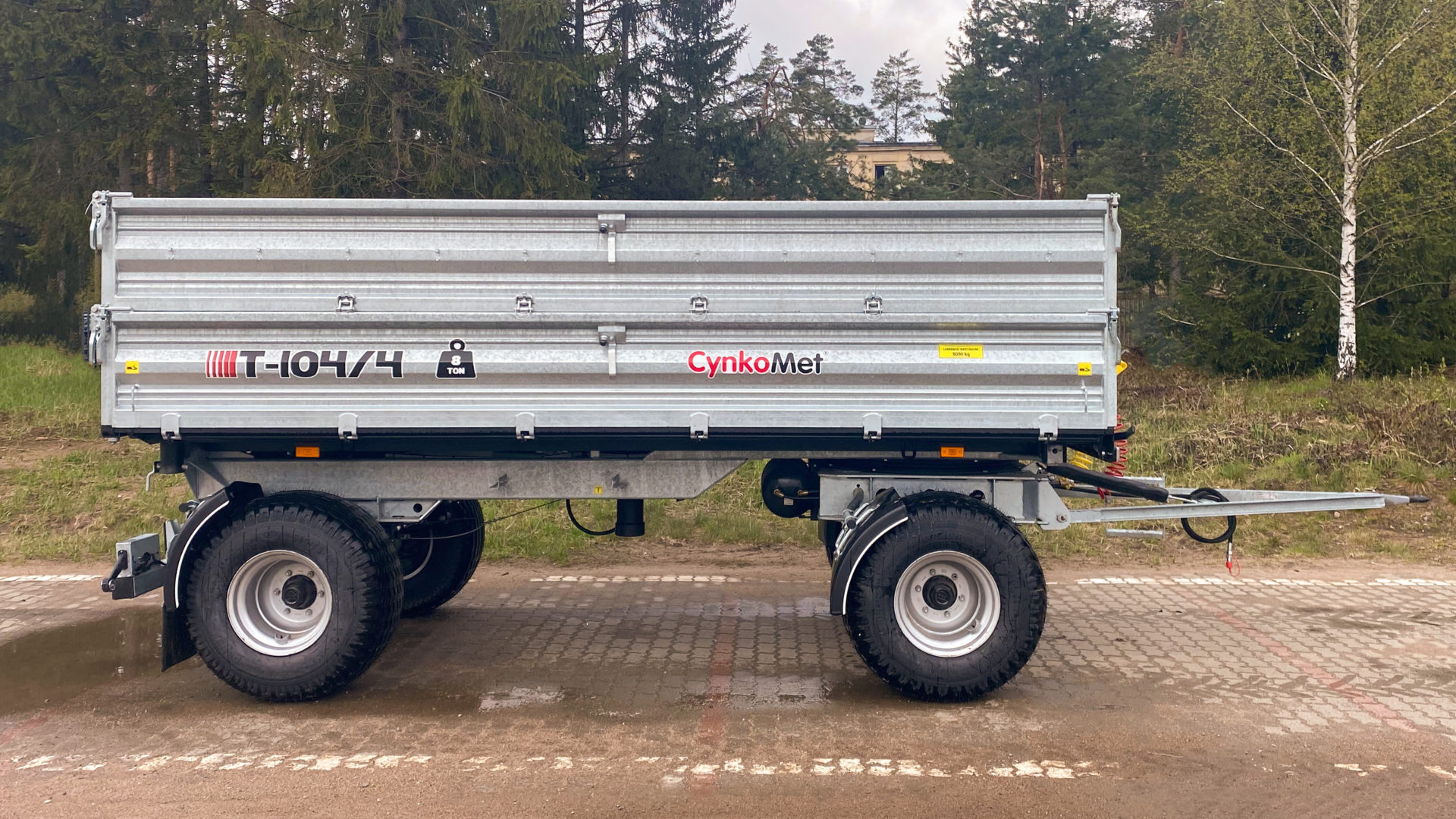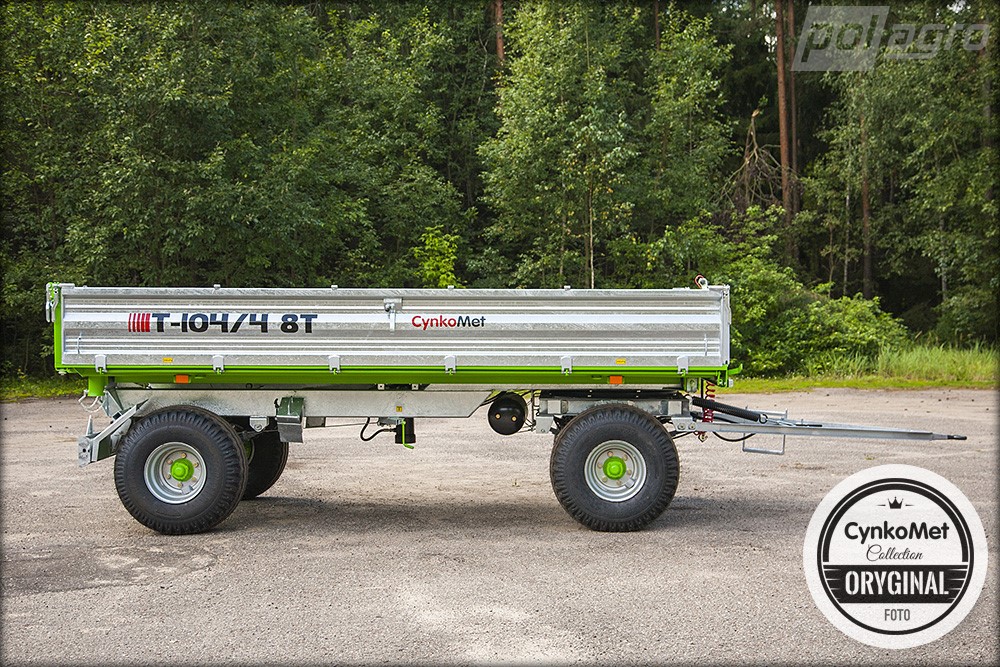 Traktorový přívěs CYNKOMET T 104/4 se třístranně sklopnou korbu. Přívěs má nosnost 8 tun. Žárově pozinkované bočnice, otočné oje a rám. Podlaha o tloušťce 4 mm je opatřena povrchovým nátěrem. Oje typu "Y" s pevným okem 40 mm. Centrální jištění bočnic. Zadní bočnice je vybavena výsypným okénkem. Žebřík a vnitřní nášlapy umožňující vstup do korby. Zakládací klíny kol. Kola 400/60 - 15,5 14PR. Navíc nabízí bohatou doplňkovou výbavu, která vyhovuje individuálním potřebám každého uživatele.
