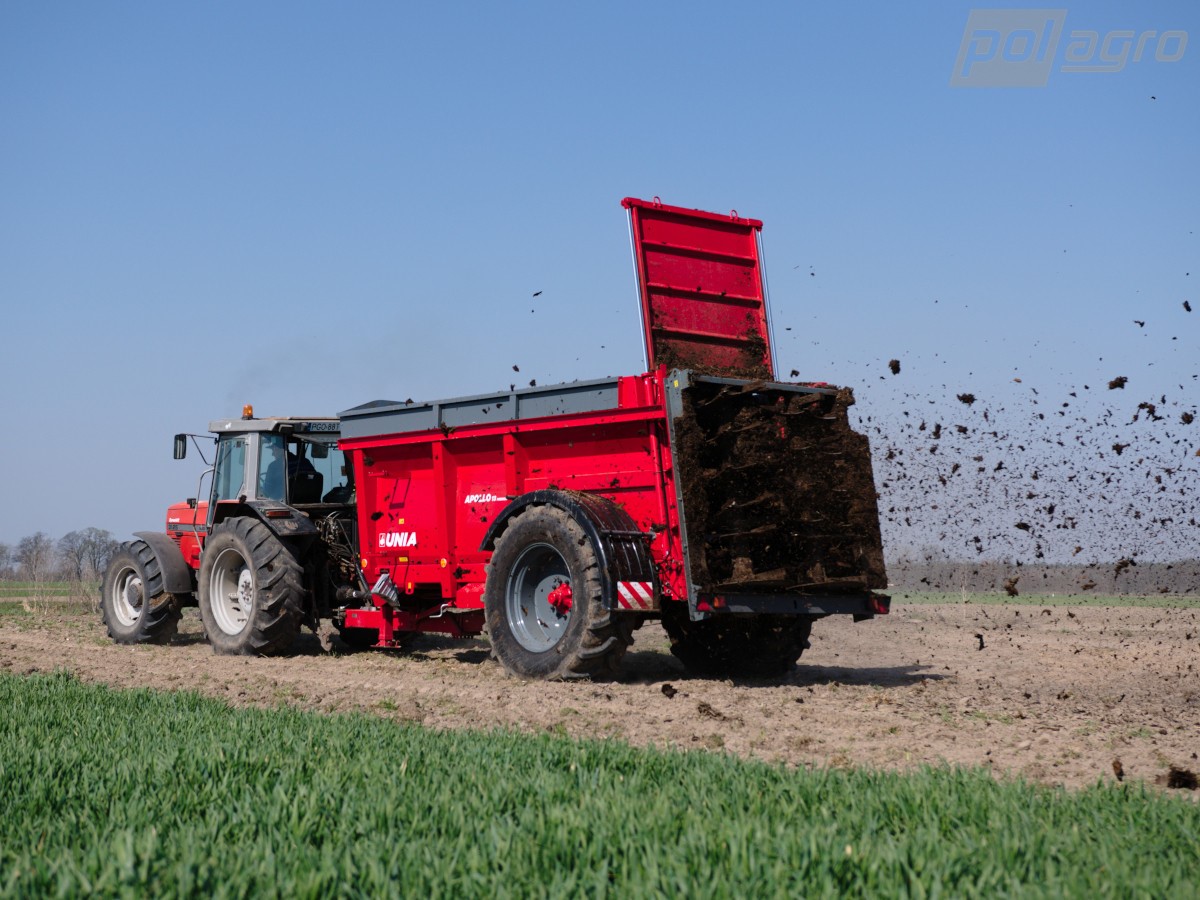 Rozmetadlo chlévské mrvy UNIA APOLLO 13 PREMIUMje určené pro širokou škálu hnojiv. Konstrukce rozmetadla je na jedné nápravě s velkými koly pro větší průjezdnost terénem.