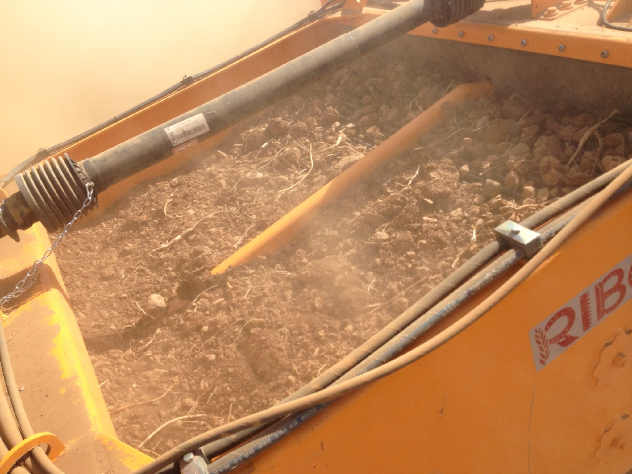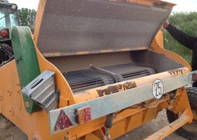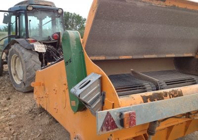 Drtič kamene s kontinuálním nakládacím systémem pro odkamení zemědělské a zahradnické půdy.