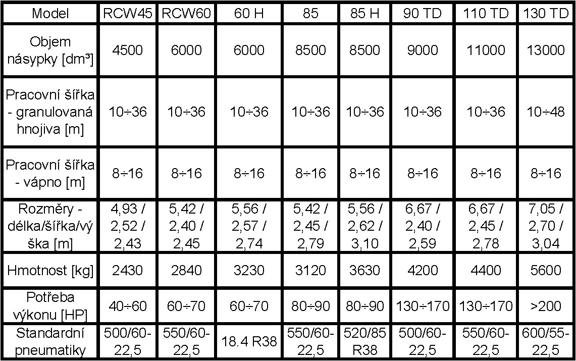 Technická specifikace: Rozmetadlo minerálních hnojiv a vápence UNIA RCW 60 H
