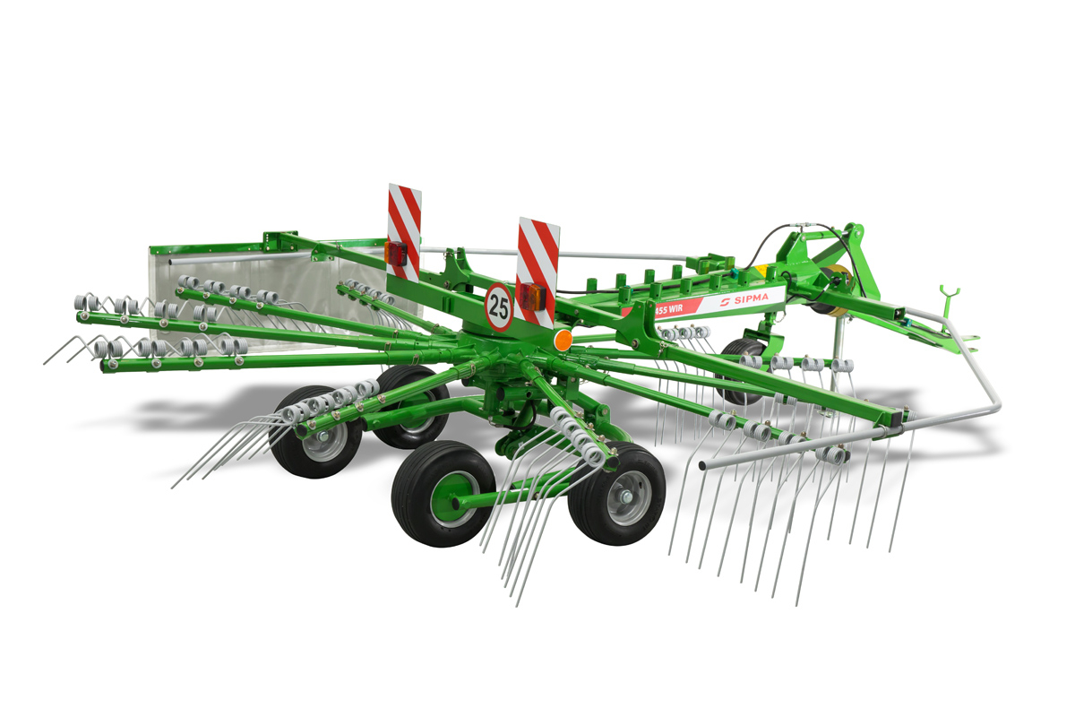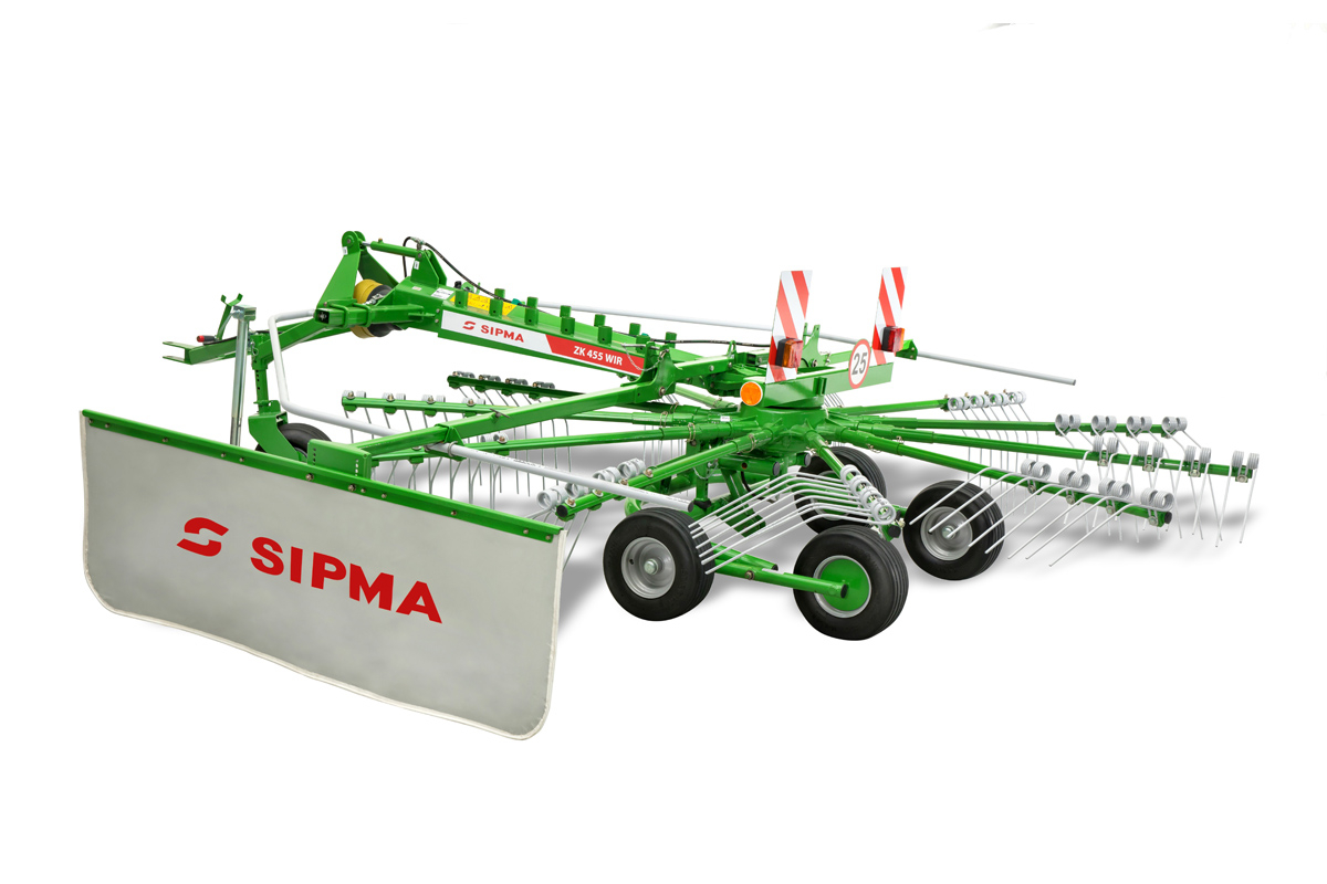 Tažený shrnovač SIPMA ZK 455 je určen ke shrnování zelené píce, slámy a sena. Je navržen pro práci na malých a středně velkých farmách. Vyznačuje se nízkými nároky na výkon traktoru. Zvedání pro transport se provádí hydraulicky pomocí hydraulických válců namontovaných na oji a podvozku. Shrnování řádků je velmi důležitým prvkem celého procesu sklizně a konzervace zelené píce. Použití shrnovačů zajišťuje získání vhodné kvality píce, nepoškozuje křehké části trav, nesnižuje jejich nutriční hodnotu a významně ovlivňuje efektivitu a kvalitu práce s následujícími stroji v technologické lince – lisy na kulaté balíky. Mechanický systém nastavení výšky shrnovače. Hydraulické zvedání rotoru do transportní polohy je prováděno hydraulickými válci namontovanými na oji a podvozku. Olejový převod zajišťuje dlouhou životnost a spolehlivý provoz. Široké pneumatiky zajišťují snadnou a pohodlnou práci. Transportní poloha usnadňuje pohodlnou přepravu a skladování shrnovače. Přestavení shrnovače do transportní polohy (bez nutnosti použití jakéhokoliv nářadí) je možné díky sklopným shrnovacím ramenům a zvednutým bezpečnostním krytům. Shrnovací ramena se čtyřmi dvojitými prsty zajišťují efektivní shrnování píce a také rovnoměrné a propustné řádky. Nastavitelná clona umožňuje nastavit vhodnou šířku vytvářených řádků. Kopírovací kolo zajišťuje nejlepší kopírování terénu, čisté shrnování v obtížných pracovních podmínkách a zlepšuje jízdu stroje. Je ideální pro nerovné povrchy – prsty shrnovače nemají žádný kontakt se zemí, méně se opotřebovávají a zachovávají si delší životnost. Podvozek tandemového typu zabraňuje znečištění píce zeminou a rychlému opotřebení prstů a také zajišťuje přesné shrnování materiálu. Toto řešení se doporučuje zejména na polích s nerovnostmi.