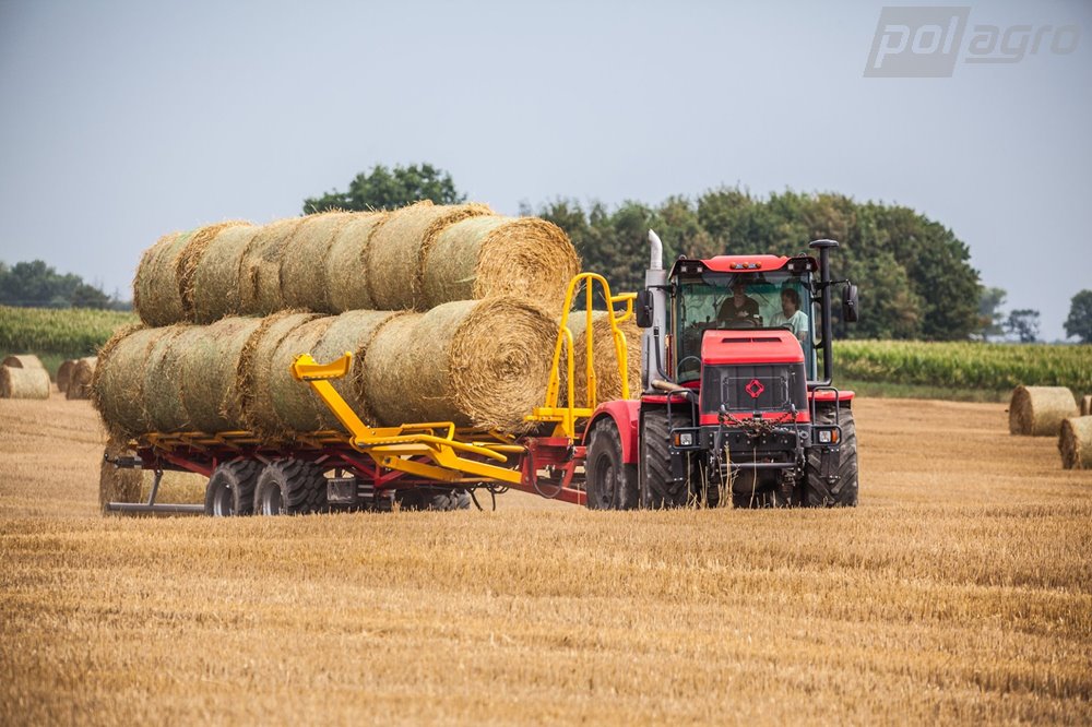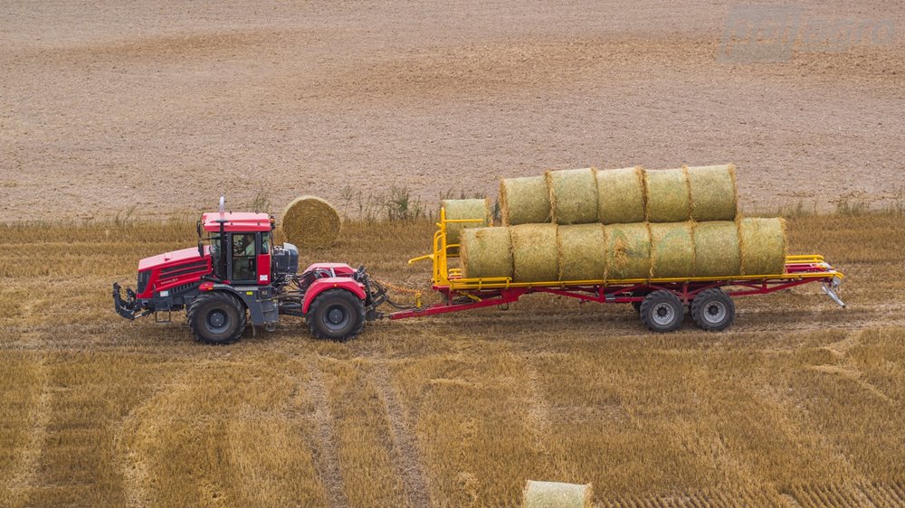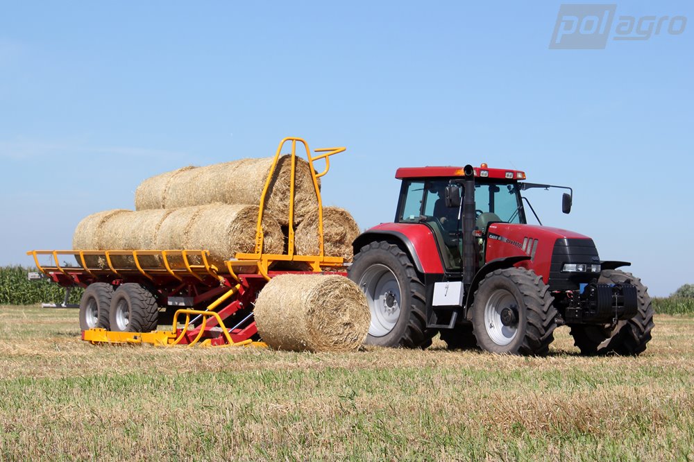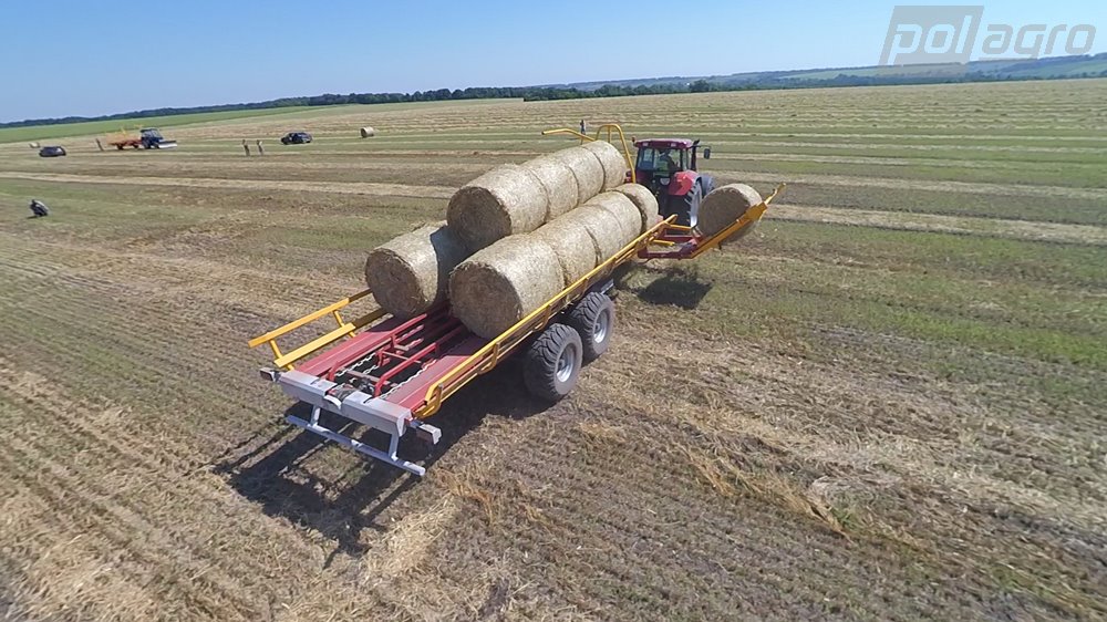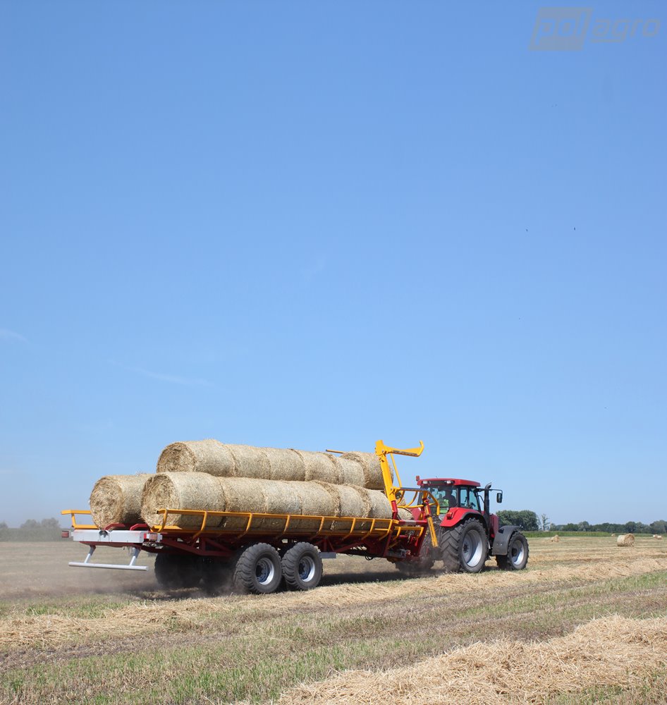 Samonakládací přívěs na balíky PT-24 je určen pro sběr, přepravu a vykládku zabalených kulatých balíků. Válečková plošina umožňuje přepravu balíků bez natažení nebo poškození plastové fólie, kterou jsou balíky zabalené. Doba nakládky 24 balíků je přibližně 12 minut. Nakládka kulatých balíků pomocí bočních vidlí stroje s hydraulickým ovládáním, balíky jsou uloženy za sebe ve dvou řadách. Následný posuv balíku po ložné ploše zajišťuje beran poháněný skrz řetězy hydromotorem. Hydraulické sklápění stroje pro plynulou vykládku balíků. Nápravy ADR, hydromotor Danfoss, spodní závěs Fi 50 Scharmüller.