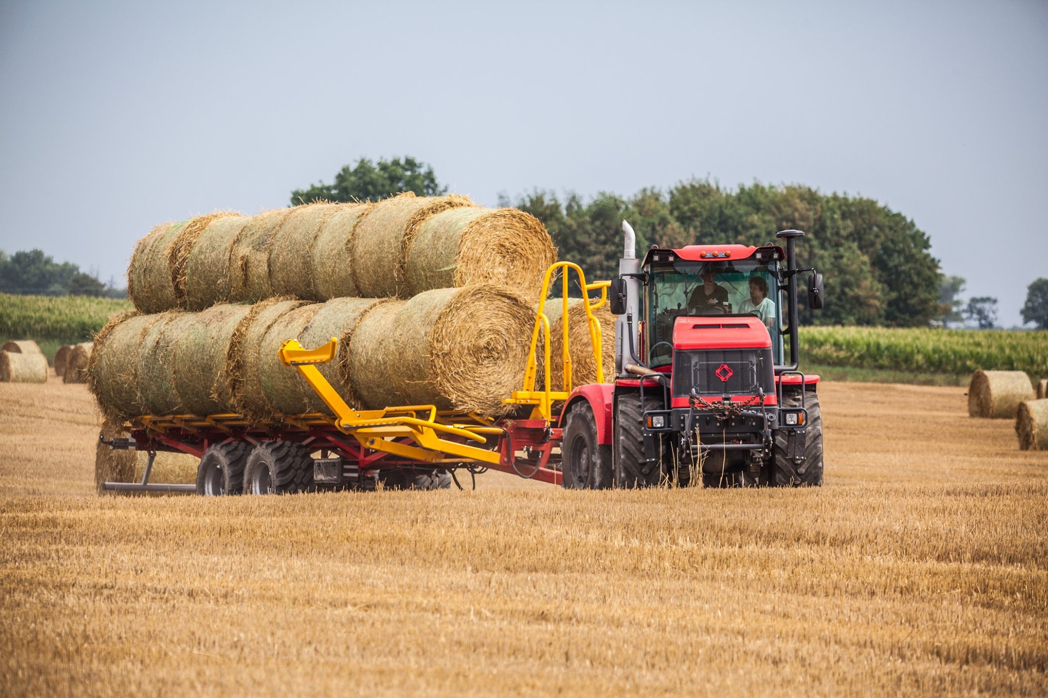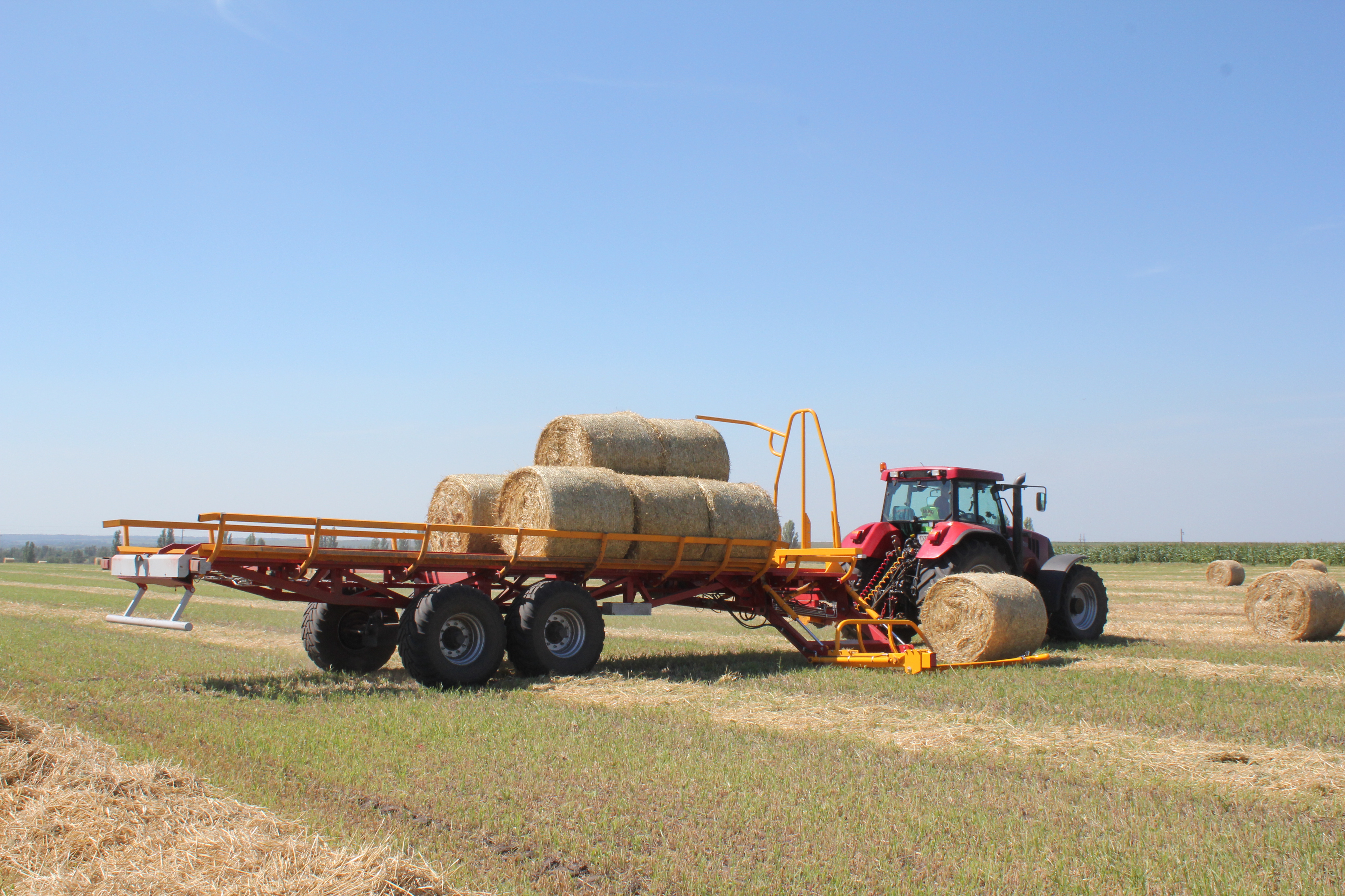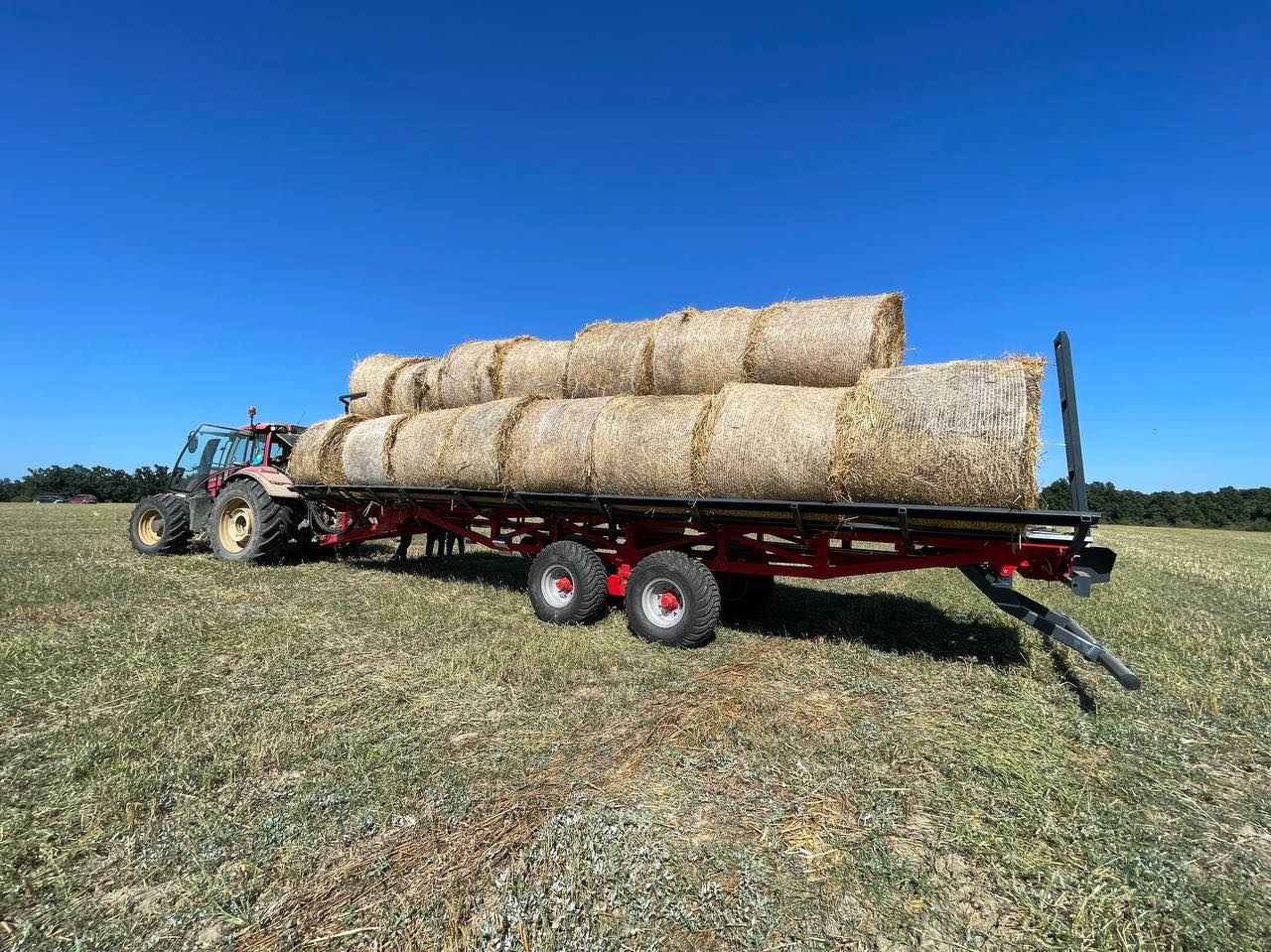 Samonakládací přívěs na balíky PT-24 je určen pro sběr, přepravu a vykládku zabalených kulatých balíků. Válečková plošina umožňuje přepravu balíků bez natažení nebo poškození plastové fólie, kterou jsou balíky zabalené. Doba nakládky 24 balíků je přibližně 12 minut. Nakládka kulatých balíků pomocí bočních vidlí stroje s hydraulickým ovládáním, balíky jsou uloženy za sebe ve dvou řadách. Následný posuv balíku po ložné ploše zajišťuje beran poháněný skrz řetězy hydromotorem. Hydraulické sklápění stroje pro plynulou vykládku balíků. Nápravy ADR, hydromotor Danfoss, spodní závěs Fi 50 Scharmüller.