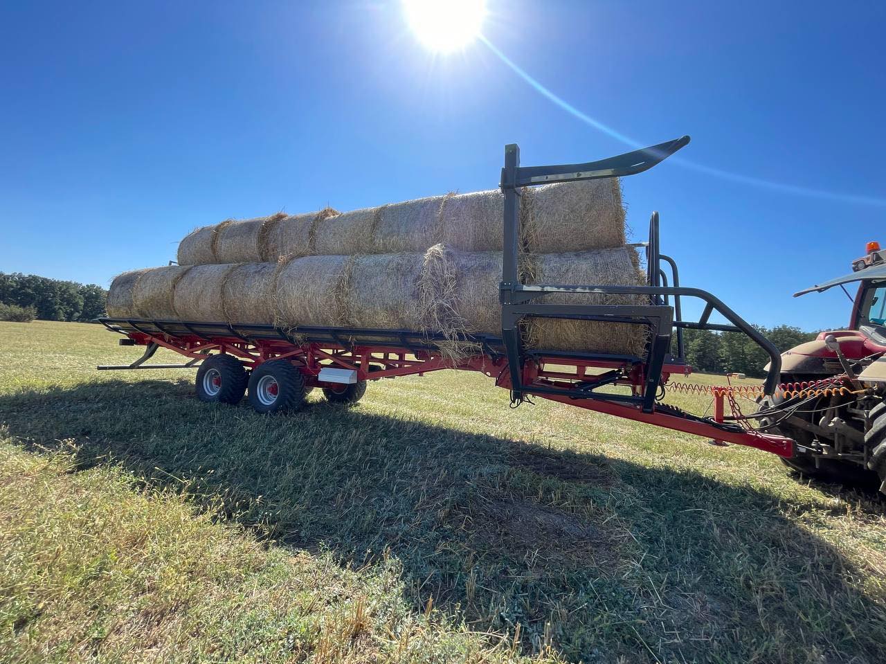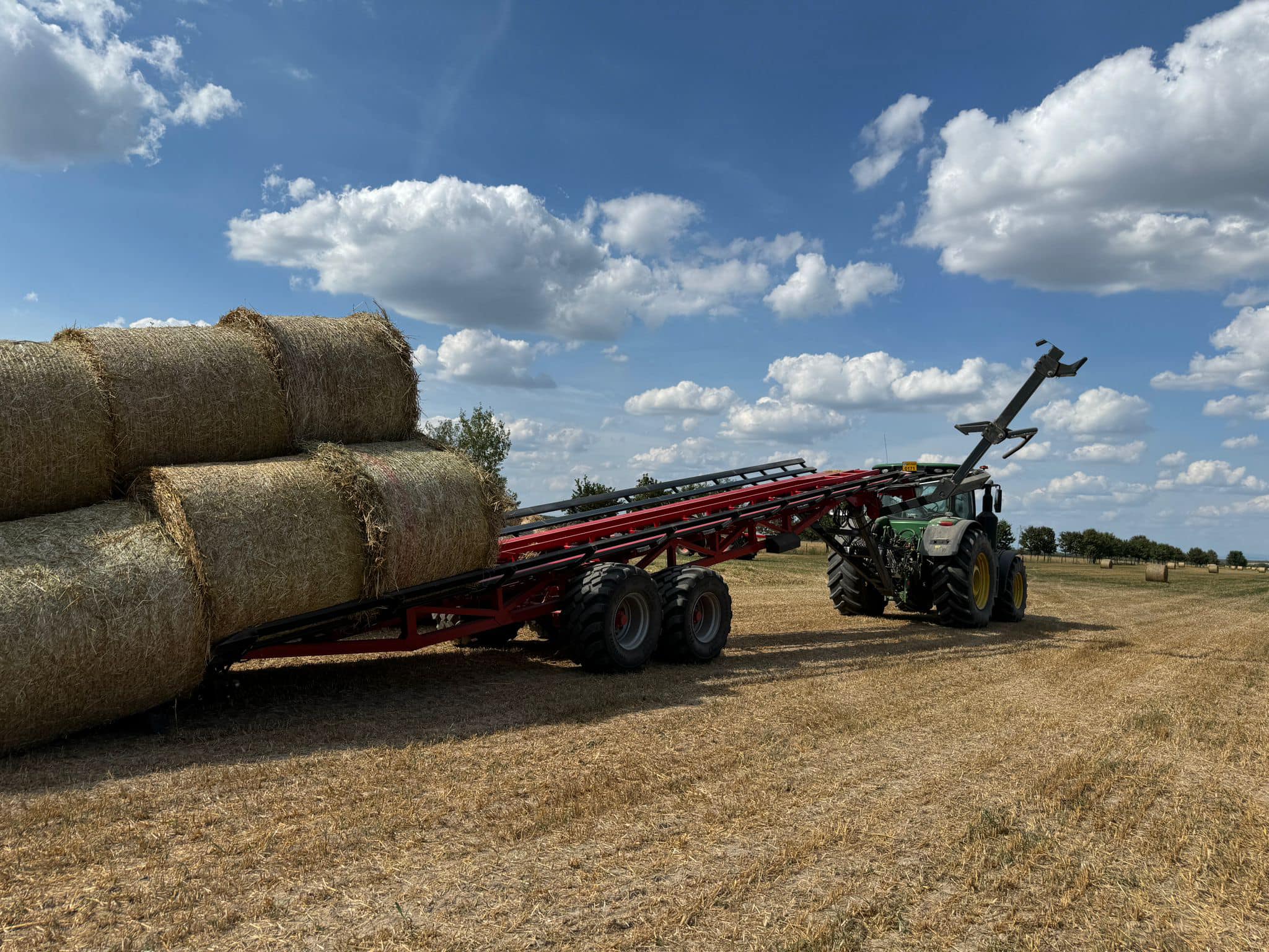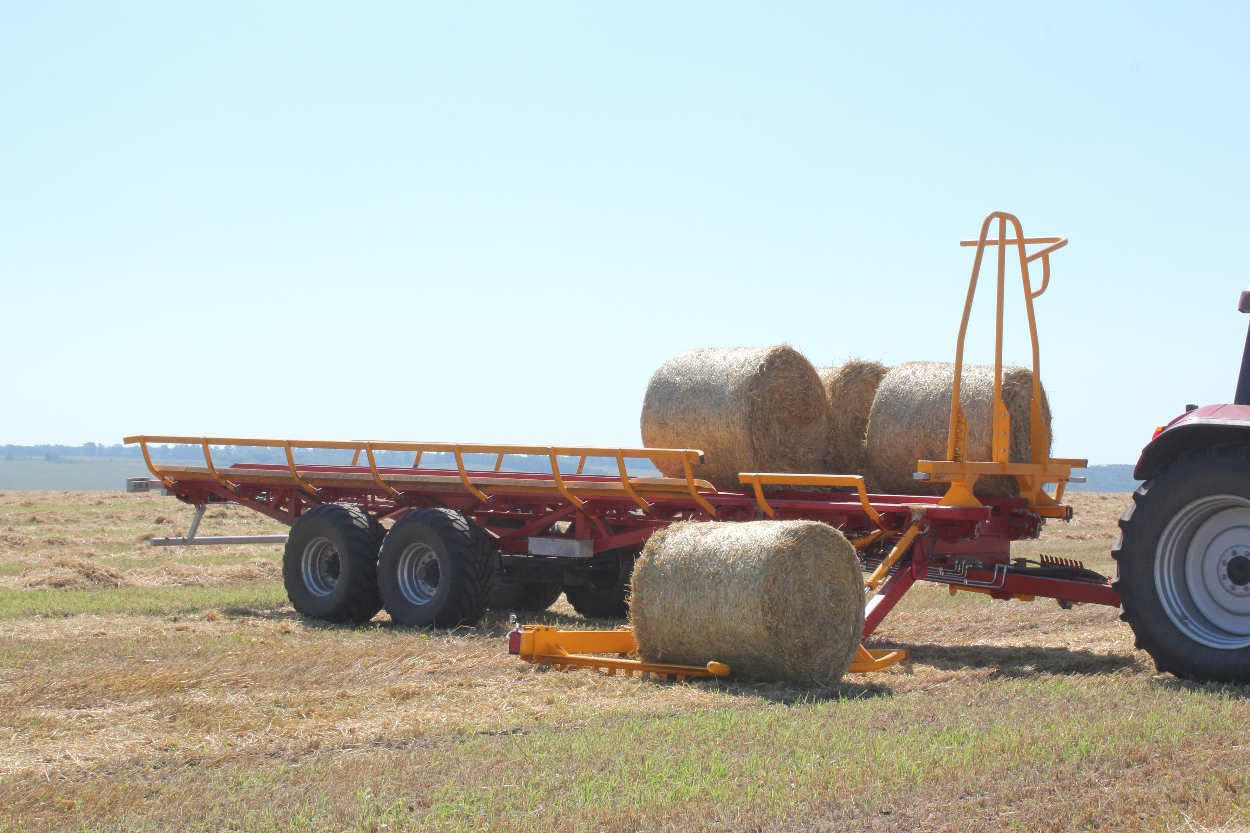 - Přívěs je vybaven zadním hydraulickým blokovacím válečkem a opěrnou nohou, které zabraňují poskakování balíků během přepravy. Před vykládkou se blokovací váleček zasune, což umožní balíkům hladce sklouznout z nakloněné plošiny na zem