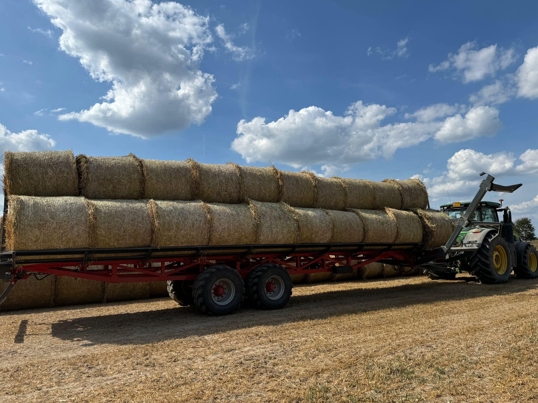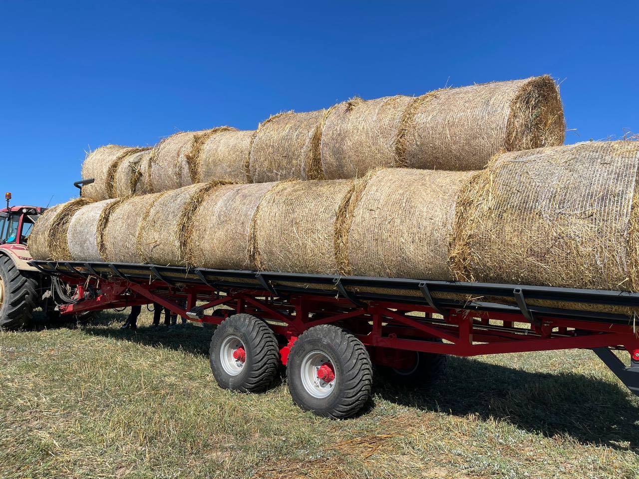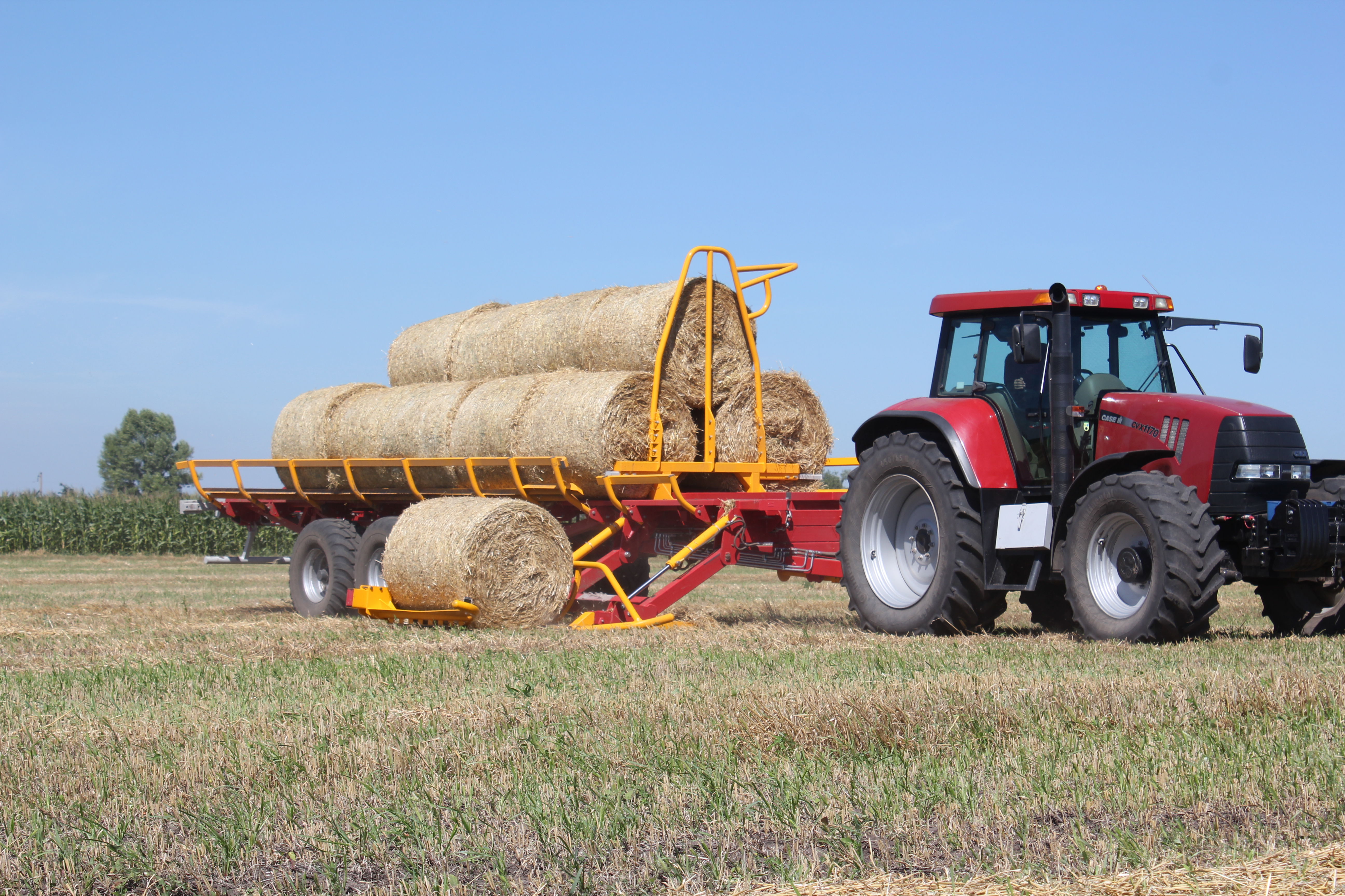 - Přívěs je vybaven zadním hydraulickým blokovacím válečkem a opěrnou nohou, které zabraňují poskakování balíků během přepravy. Před vykládkou se blokovací váleček zasune, což umožní balíkům hladce sklouznout z nakloněné plošiny na zem