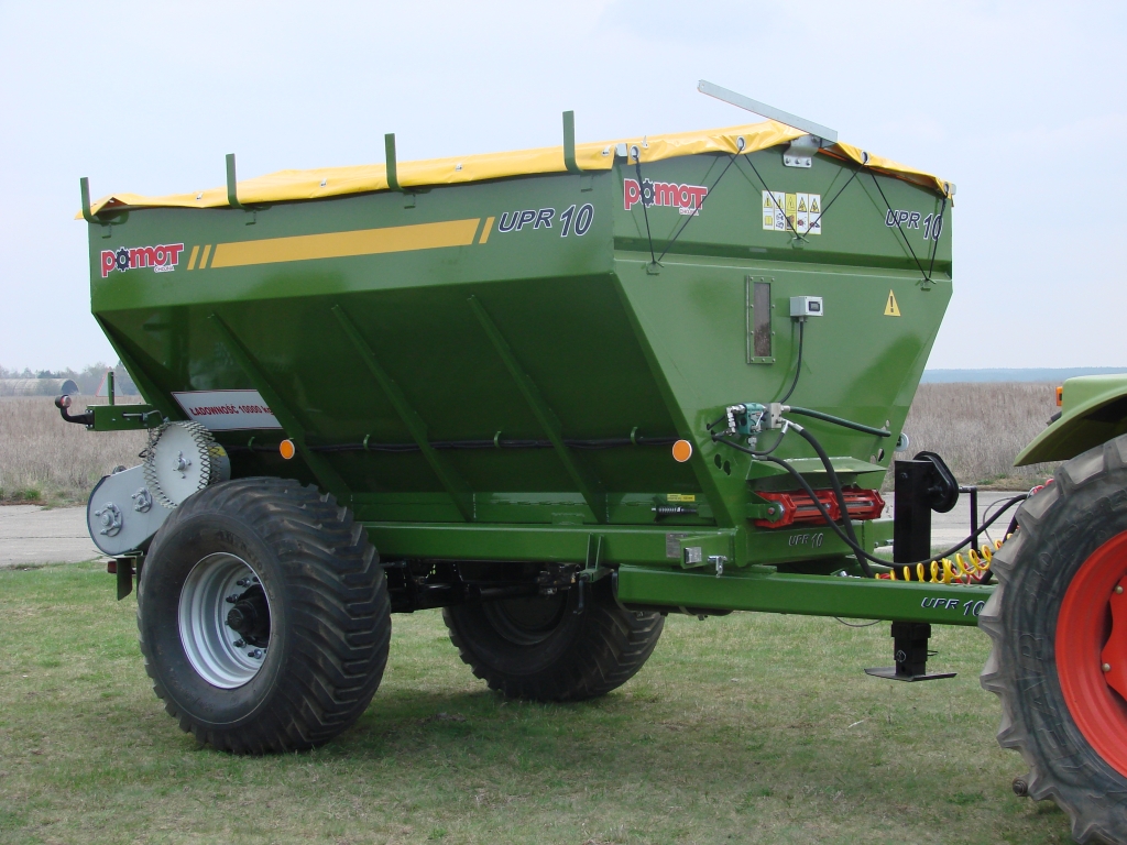 Rozmetadlo minerálních hnojiv POMOT UPR je určené pro granulovaná a sypká hnojiva. Tažené rozmetadlo je možno vybavit řetězovým nebo gumovým dopravníkem. Násypná skříň je vyrobena z nerezové oceli a opatřena dvousložkovým nátěrem. Podlaha skříně je pokryta plastovým povrchem, který zabraňuje nalepení materíálu. Ŕetězový dopravník garantuje rovnoměrné podávání materíálu na rozmetací kotouče. Dvojité čištění podlahového dopravníku pomocí kartáčů. Pohon řetězového dopravníku od 3 stupňové převodové skříně poháněné od pojezdového kola garantující stabilní dávku bez ohledu na pojezdovou rychlost. S okamžitou možností vypnutí podlahového dopravníku. Rozmetací kotouče z otěruvzdorné oceli RAEX 400. Pohon rozmetacích kotoučů hydraulickým okruhem z traktoru (čerpadlo min 50 l/min). Regulace šířky rozmetání pomocí škrtícího ventilu. Rozhoz 2 - 32 metrů. Možnost hraničního hnojení. Ukazatel otáček rozmetacích kotoučů na čelní stěně.