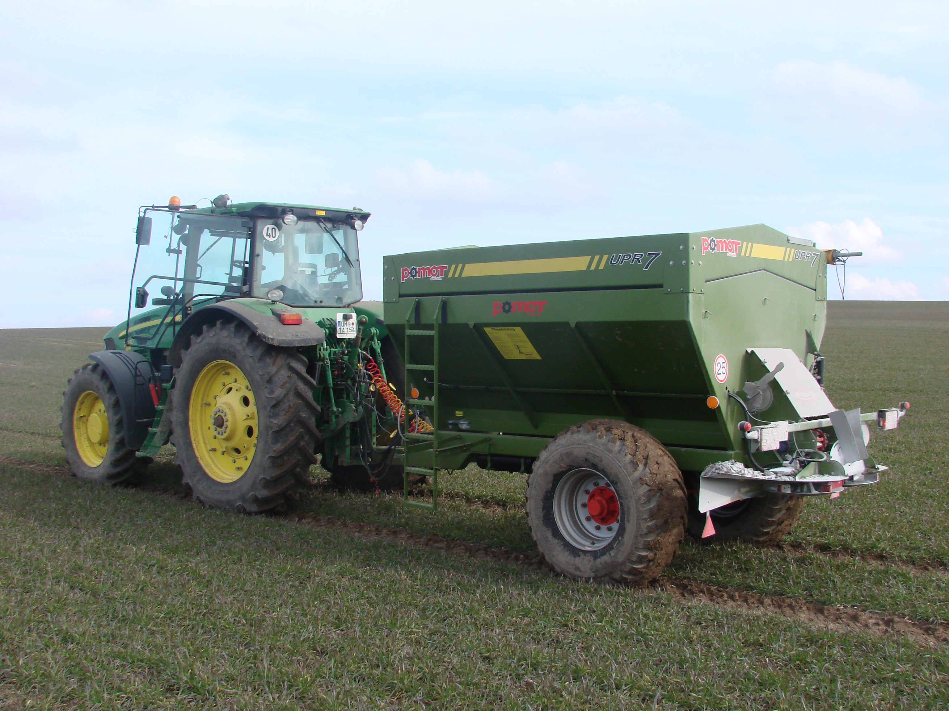 Rozmetadlo minerálních hnojiv POMOT UPR je určené pro granulovaná a sypká hnojiva. Tažené rozmetadlo je možno vybavit řetězovým nebo gumovým dopravníkem. Násypná skříň je vyrobena z nerezové oceli a opatřena dvousložkovým nátěrem. Podlaha skříně je pokryta plastovým povrchem, který zabraňuje nalepení materíálu. Ŕetězový dopravník garantuje rovnoměrné podávání materíálu na rozmetací kotouče. Dvojité čištění podlahového dopravníku pomocí kartáčů. Pohon řetězového dopravníku od 3 stupňové převodové skříně poháněné od pojezdového kola garantující stabilní dávku bez ohledu na pojezdovou rychlost. S okamžitou možností vypnutí podlahového dopravníku. Rozmetací kotouče z otěruvzdorné oceli RAEX 400. Pohon rozmetacích kotoučů hydraulickým okruhem z traktoru (čerpadlo min 50 l/min). Regulace šířky rozmetání pomocí škrtícího ventilu. Rozhoz 2 - 32 metrů. Možnost hraničního hnojení. Ukazatel otáček rozmetacích kotoučů na čelní stěně.