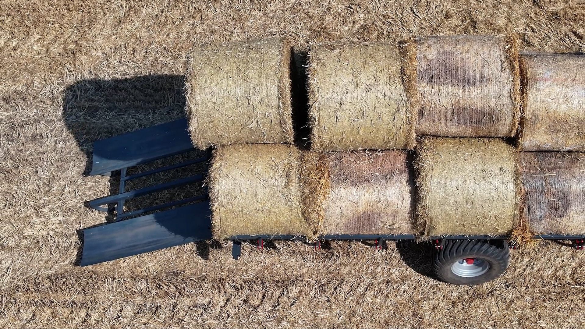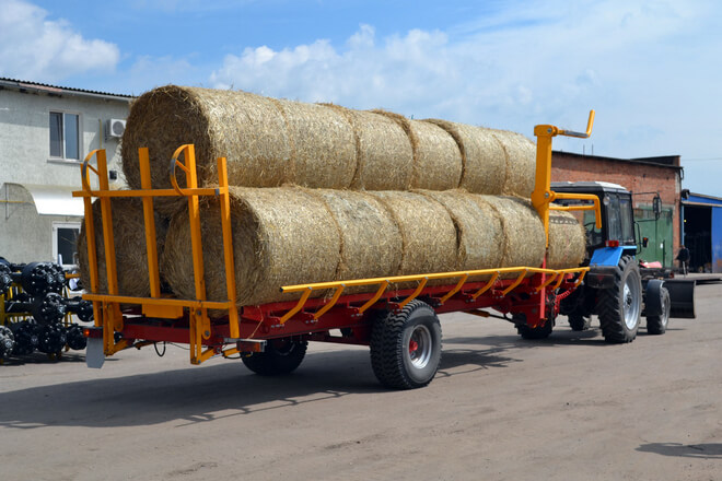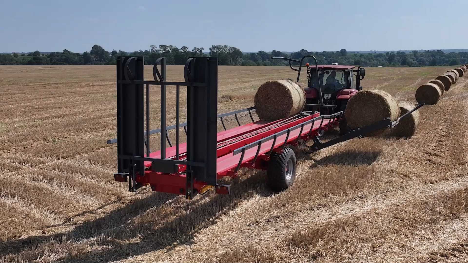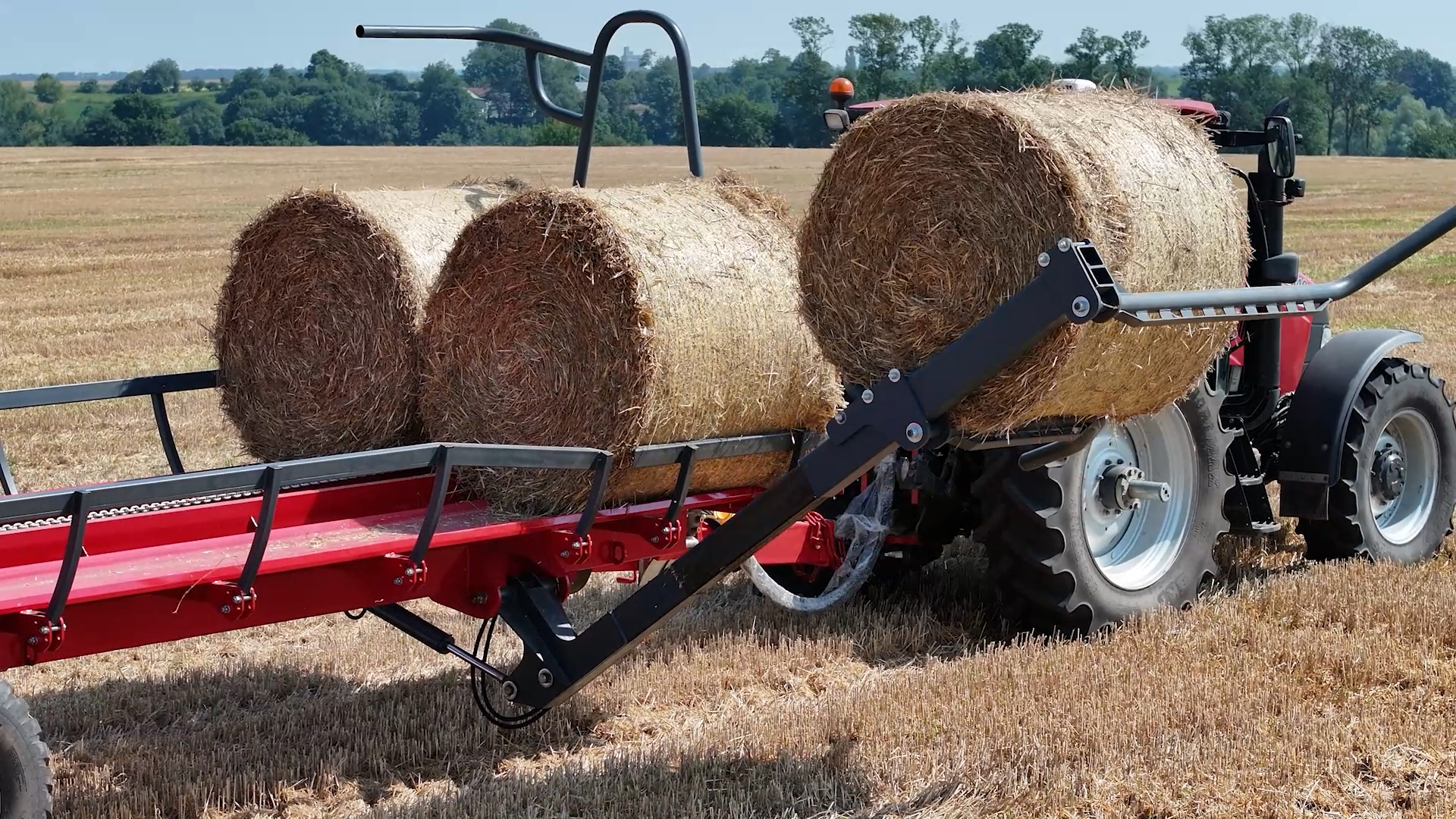 - Teleskopické nakládací rameno: Umožňuje nakládání třetí řady balíků, čímž snižuje počet jízd mezi polem a farmou. Přívěs tak zvládne přepravit až 18 balíků na jeden zátah