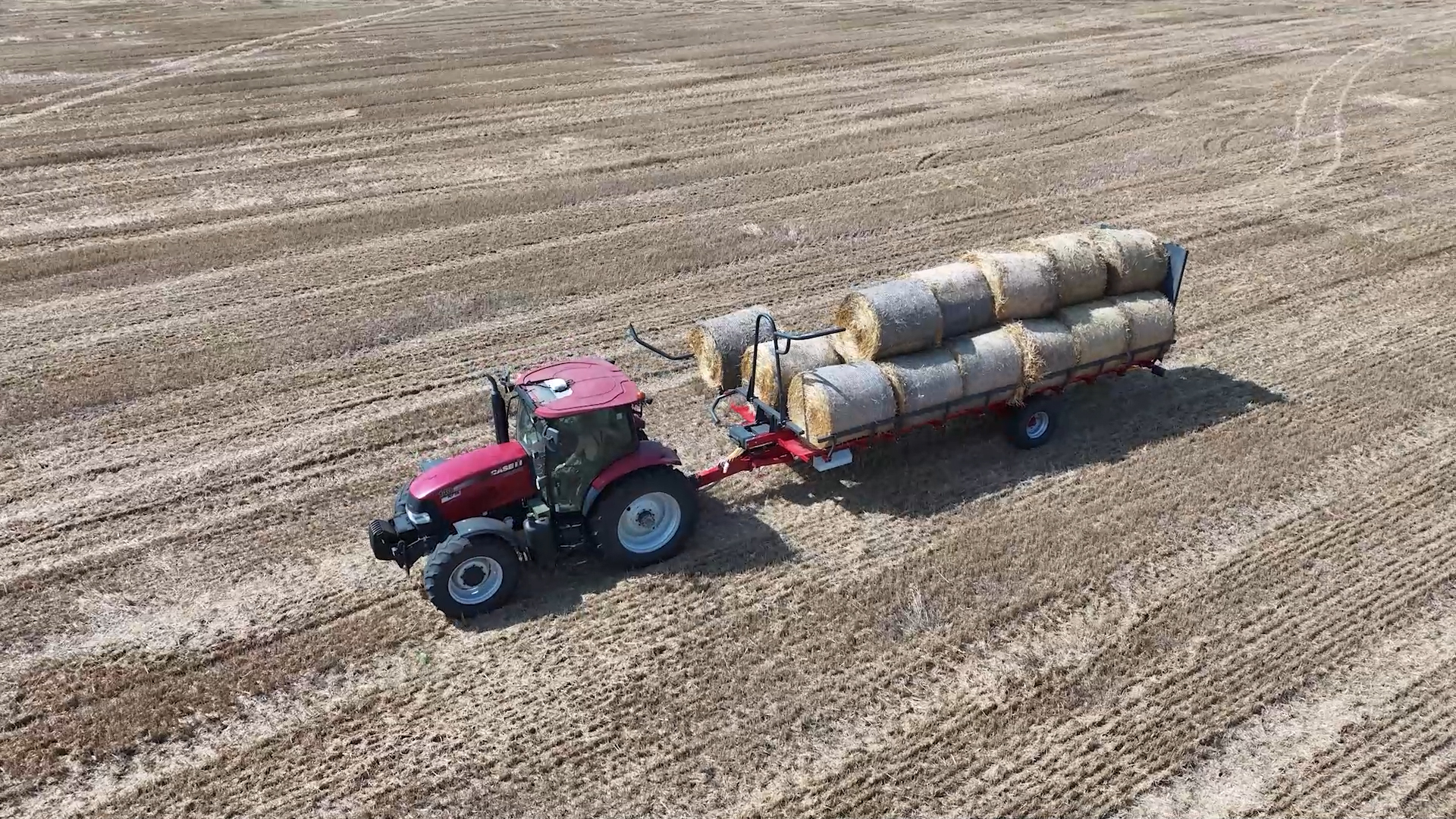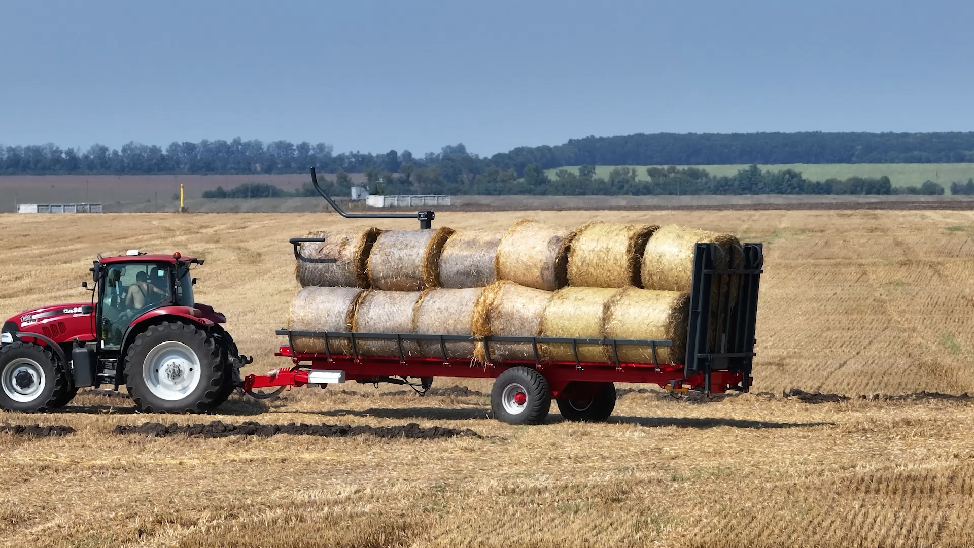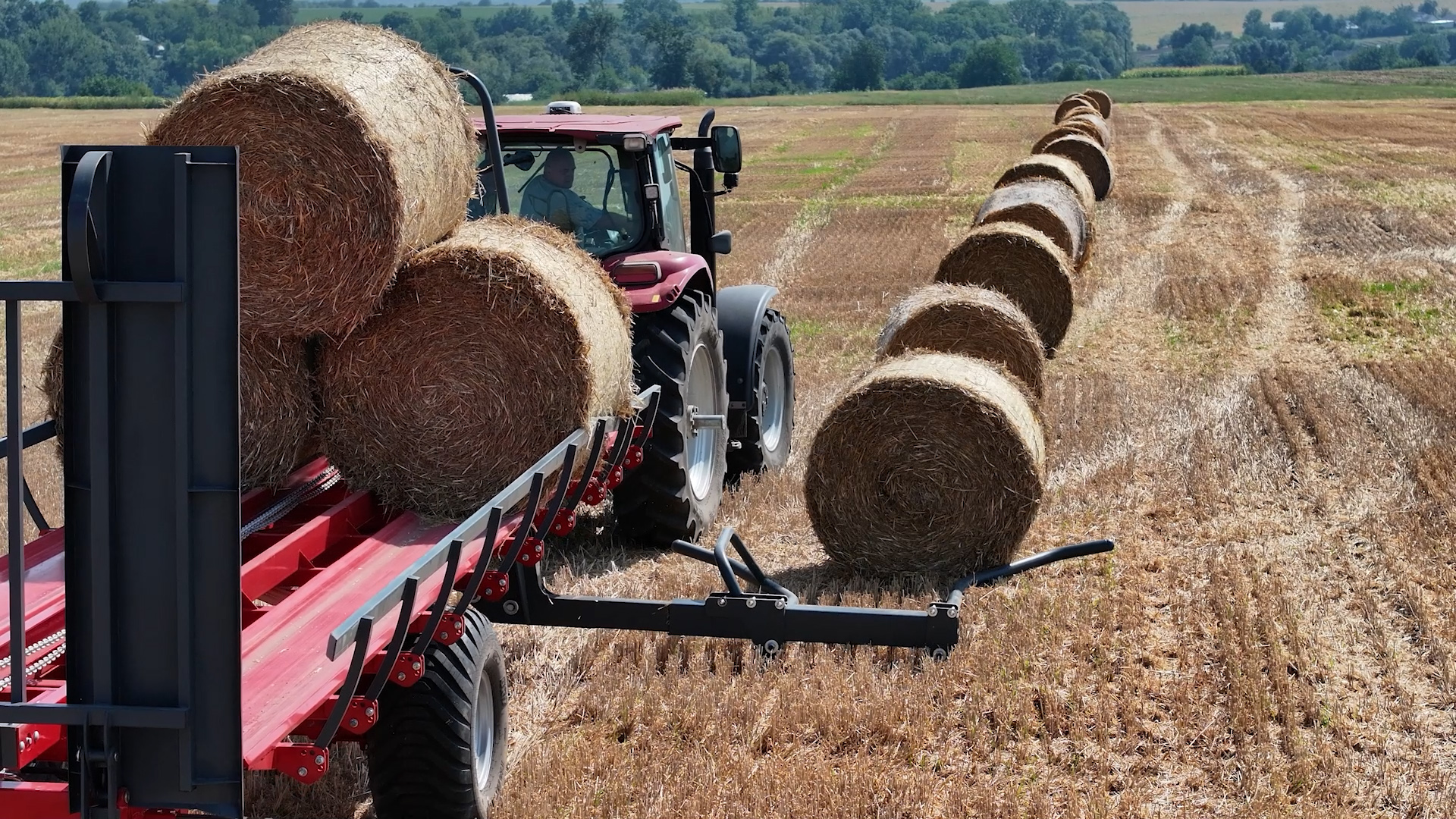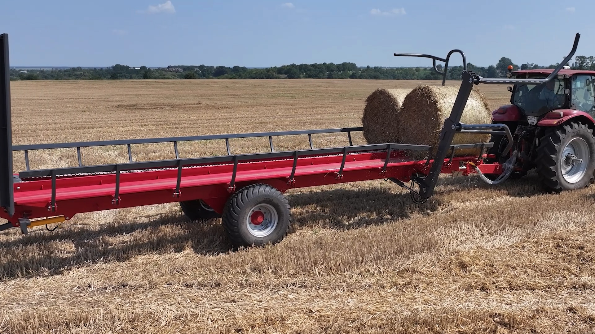 - Teleskopické nakládací rameno: Umožňuje nakládání třetí řady balíků, čímž snižuje počet jízd mezi polem a farmou. Přívěs tak zvládne přepravit až 18 balíků na jeden zátah
