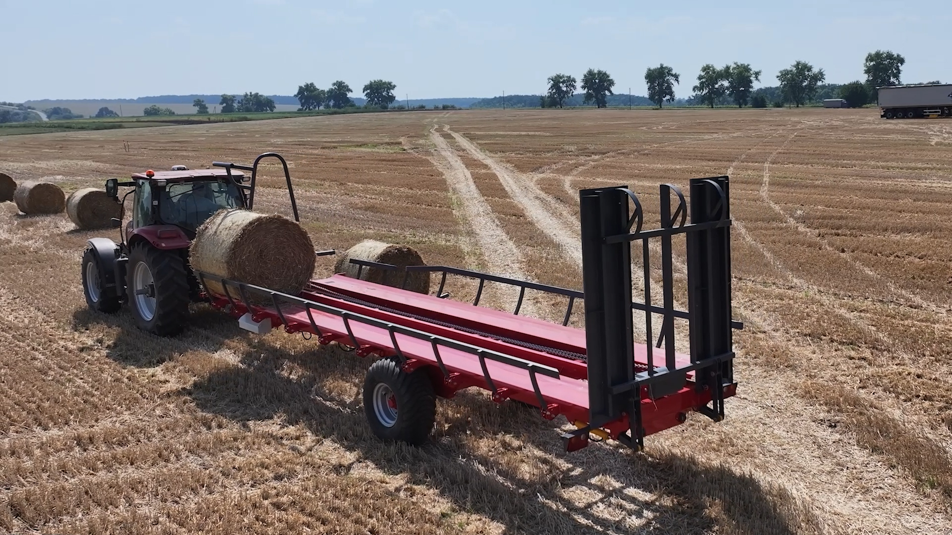 - Hydraulicky uzamykatelný zadní válec: Zabraňuje balíkům v pohybu během nakládky a přepravy z pole na místo skladování. Válec se před vykládkou platformy hydraulicky zasune, což umožní plynulé sklouznutí balíků na zem
